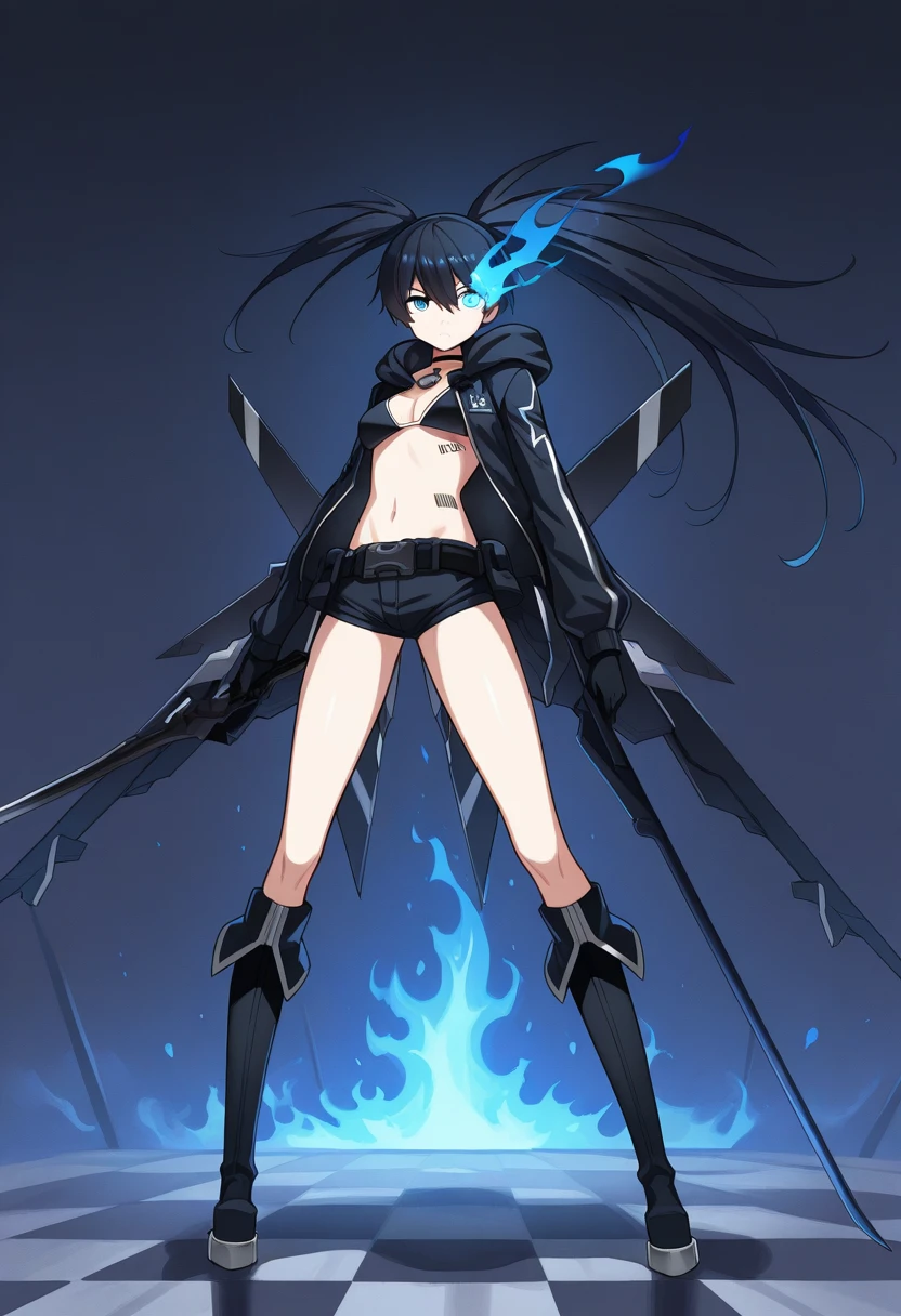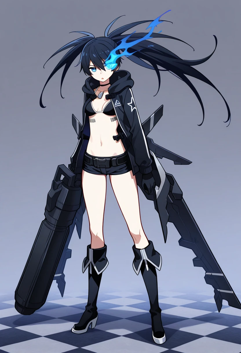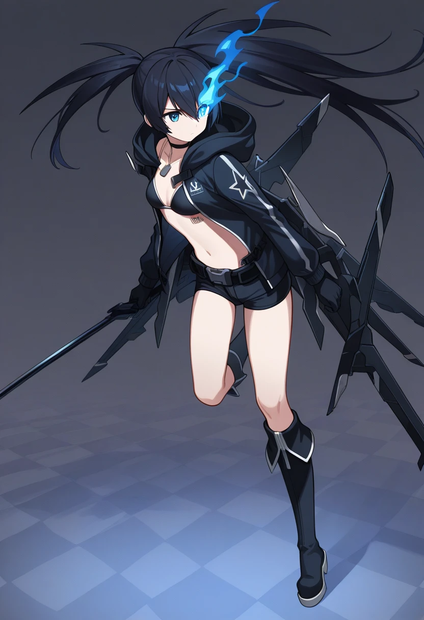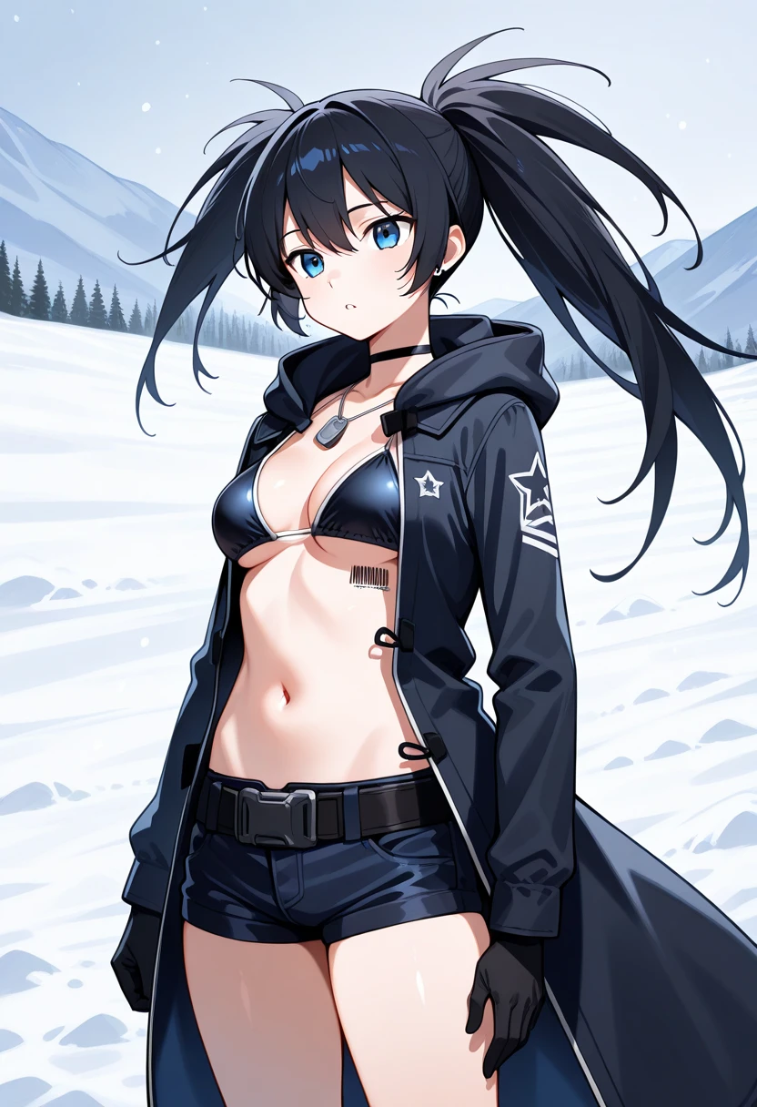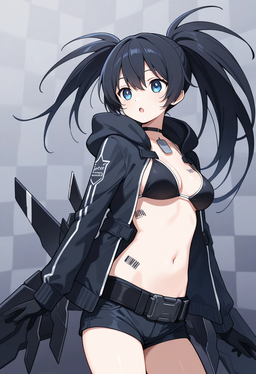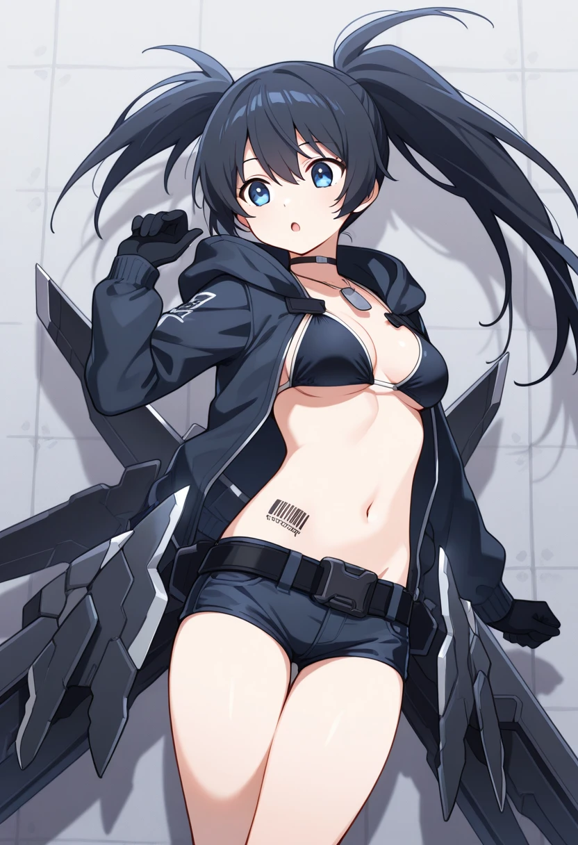 Keywords: stella2035, black hair, long hair, uneven twintails, blue eyes, dog tags, choker, jacket, hood down, gloves, medium breasts, bikini top only, barcode tattoo, short shorts, belt, mechanical wings, knee boots