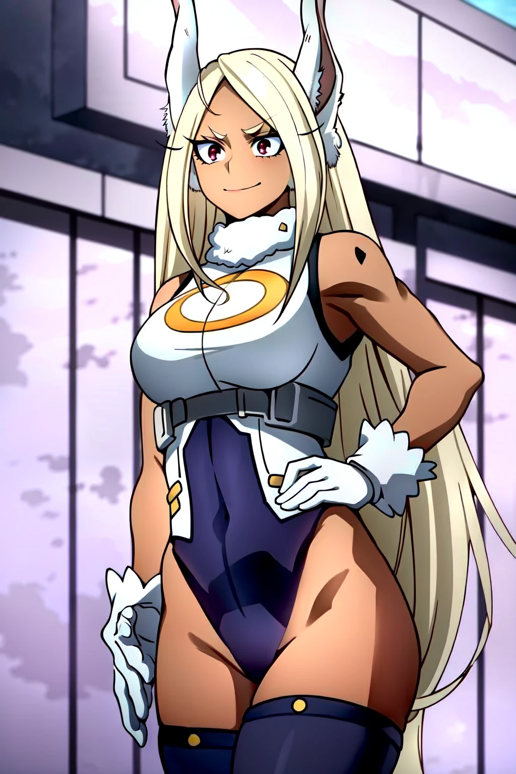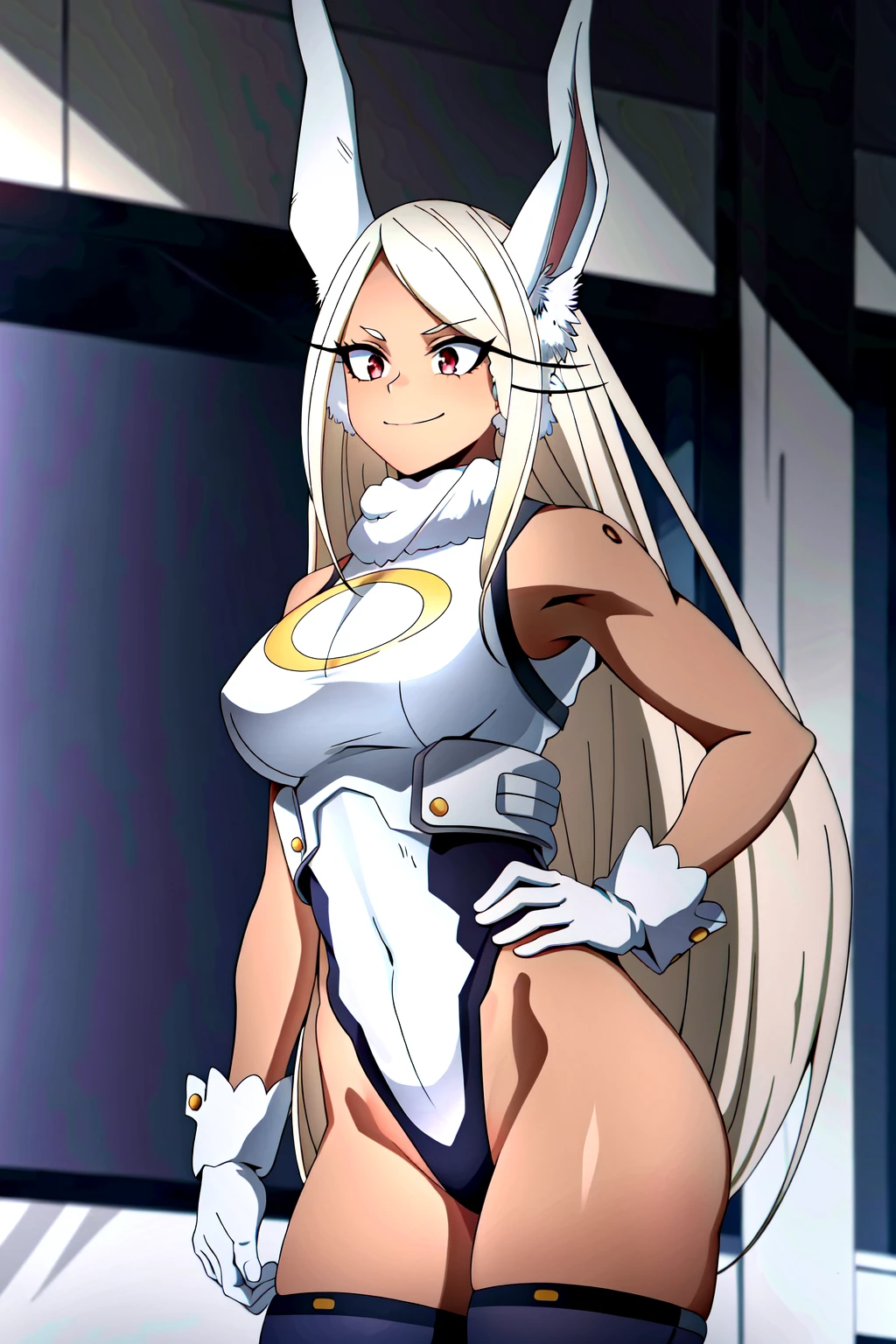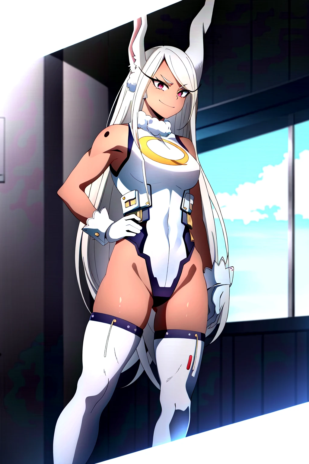 Rumi Usagiyama, 1girl, solo, animal ears, dark-skinned female, long hair, rabbit ears, dark skin, mirko, leotard, gloves, thighhighs, red eyes, highleg leotard, white hair, highleg, smile, white gloves, rabbit girl, very long hair, white leotard, hand on hip, turtleneck, sleeveless, breasts, sleeveless turtleneck, purple thighhighs, sleeveless turtleneck leotard