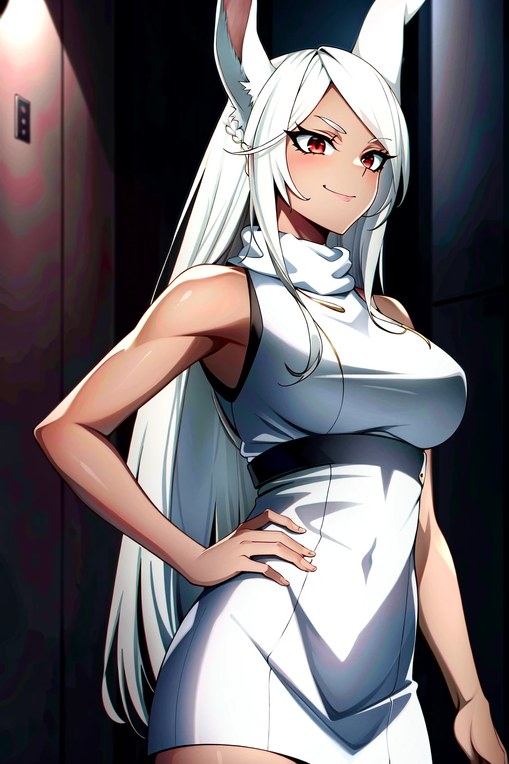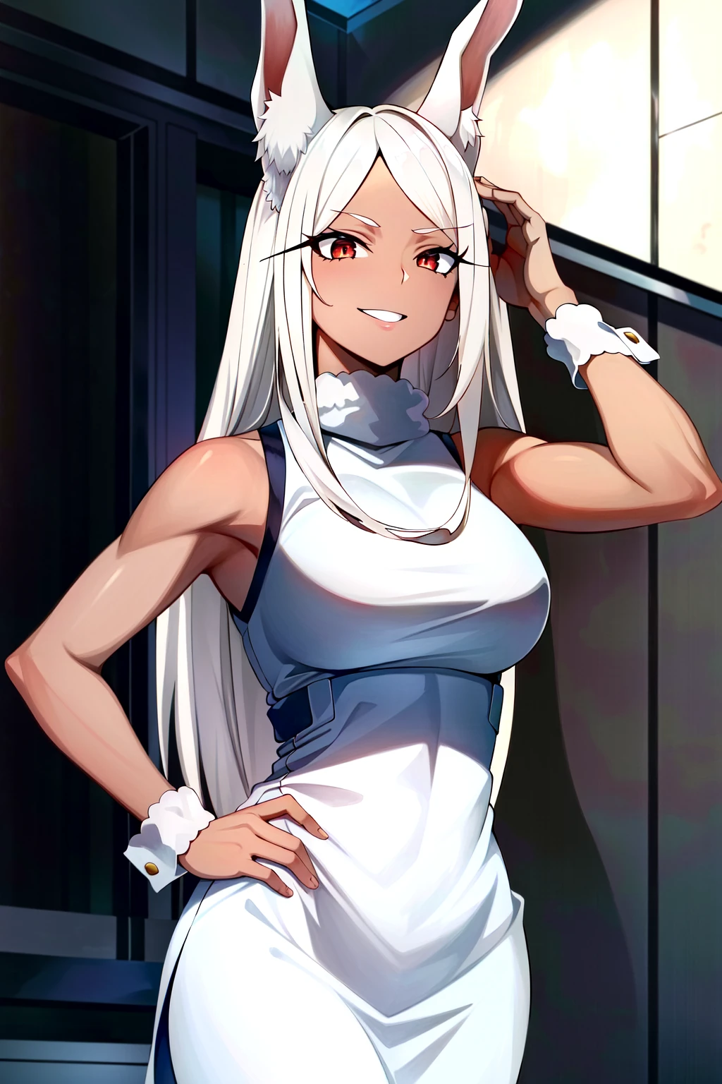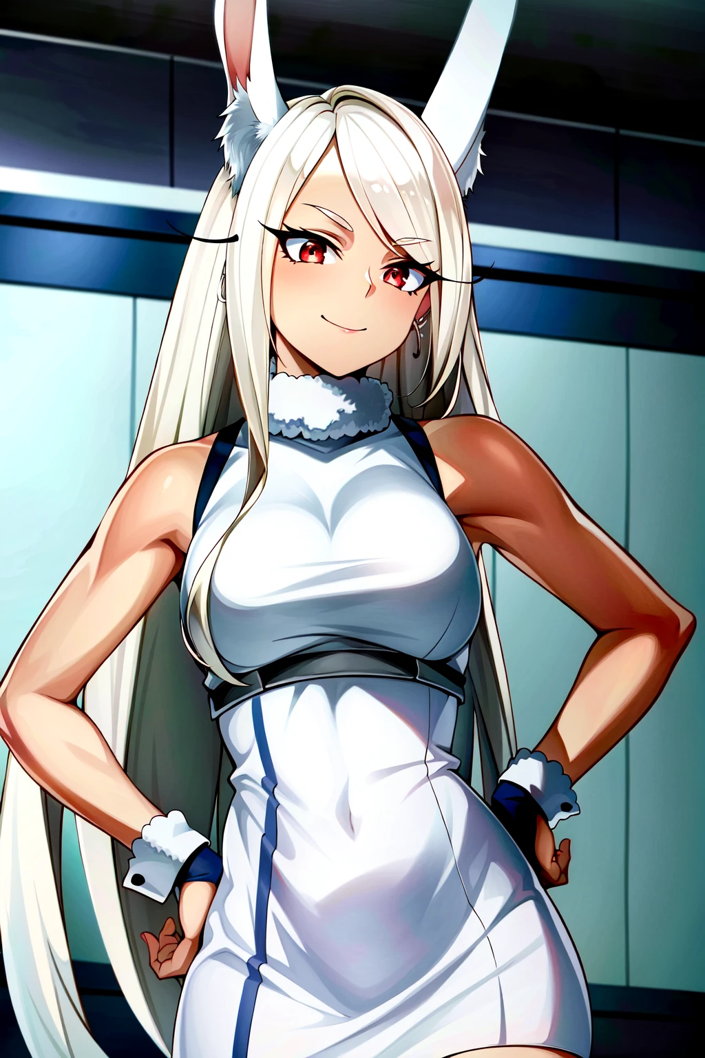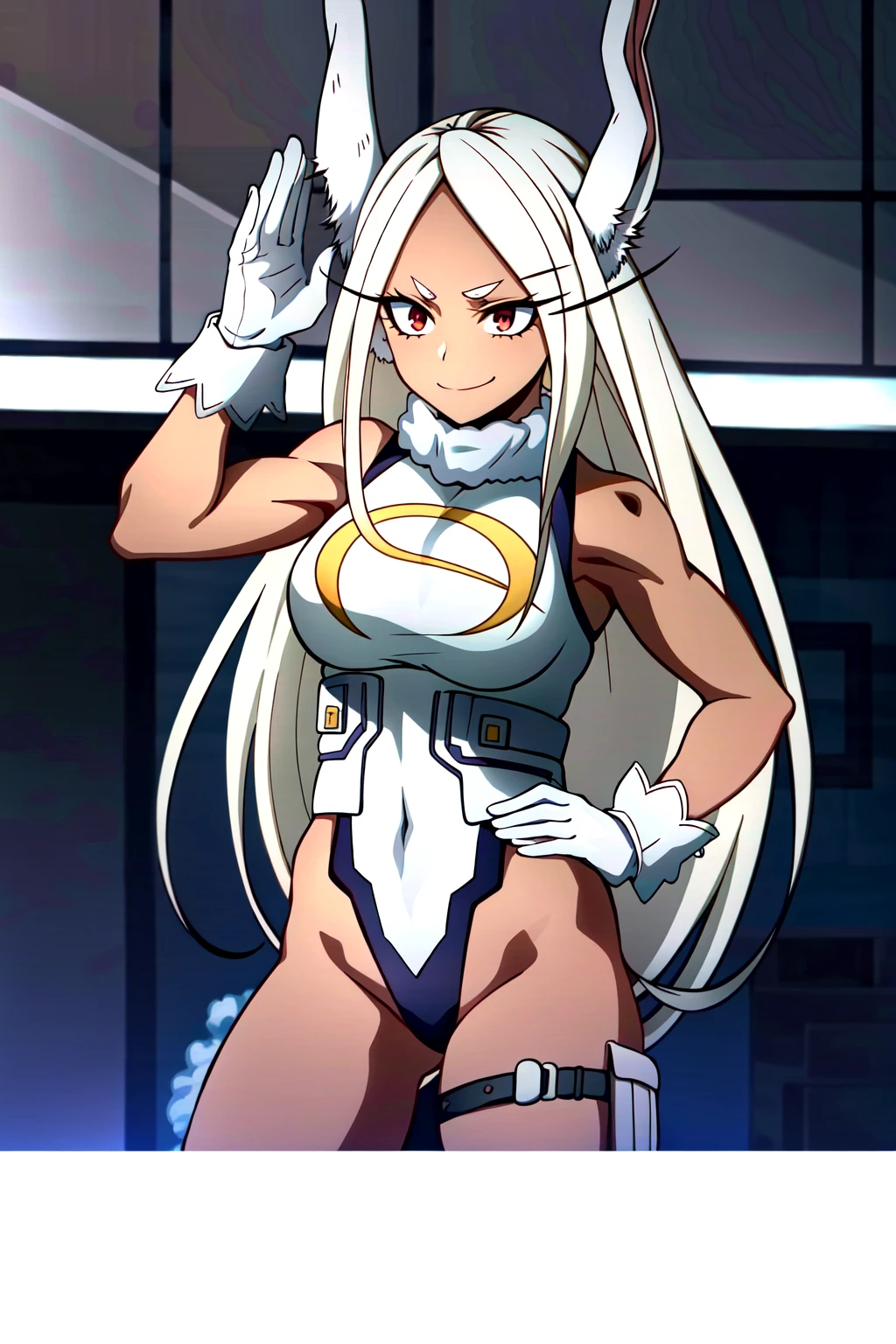 Rumi Usagiyama, 1girl, solo, animal ears, dark-skinned female, long hair, rabbit ears, dark skin, mirko, leotard, gloves, thighhighs, red eyes, highleg leotard, white hair, highleg, smile, white gloves, rabbit girl, very long hair, white leotard, hand on hip, turtleneck, sleeveless, breasts, sleeveless turtleneck, purple thighhighs, sleeveless turtleneck leotard