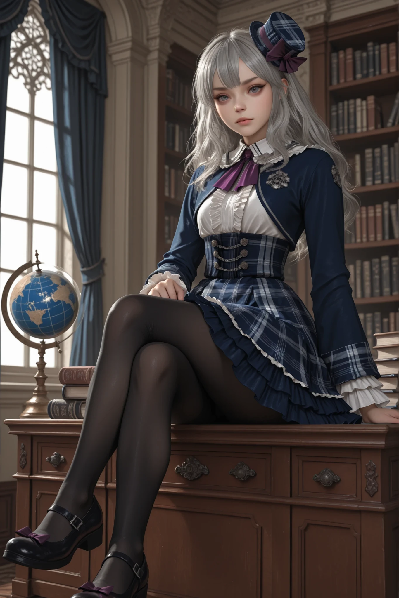 mini top hat, dress, long sleeves, frills, plaid skirt, black pantyhose,