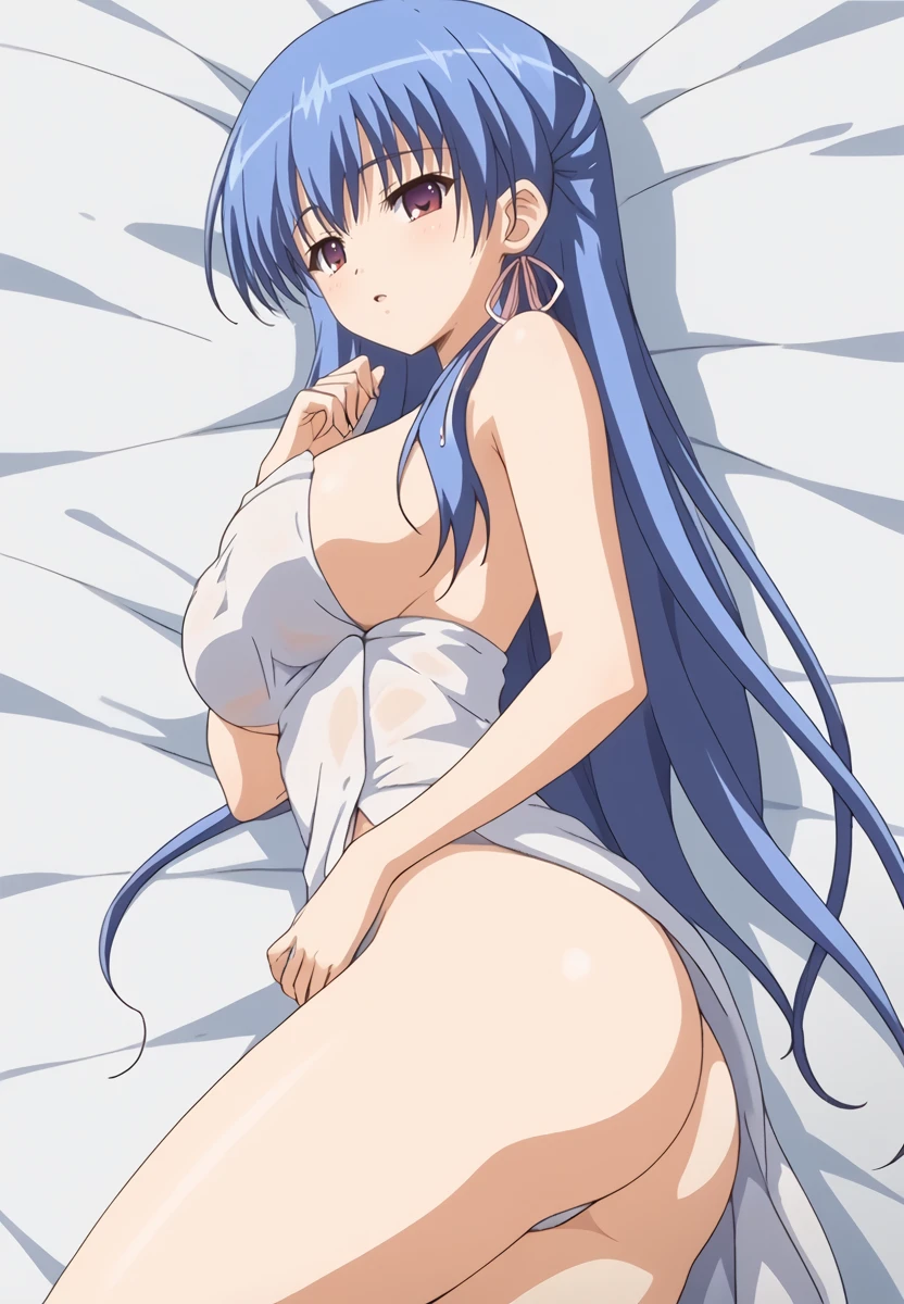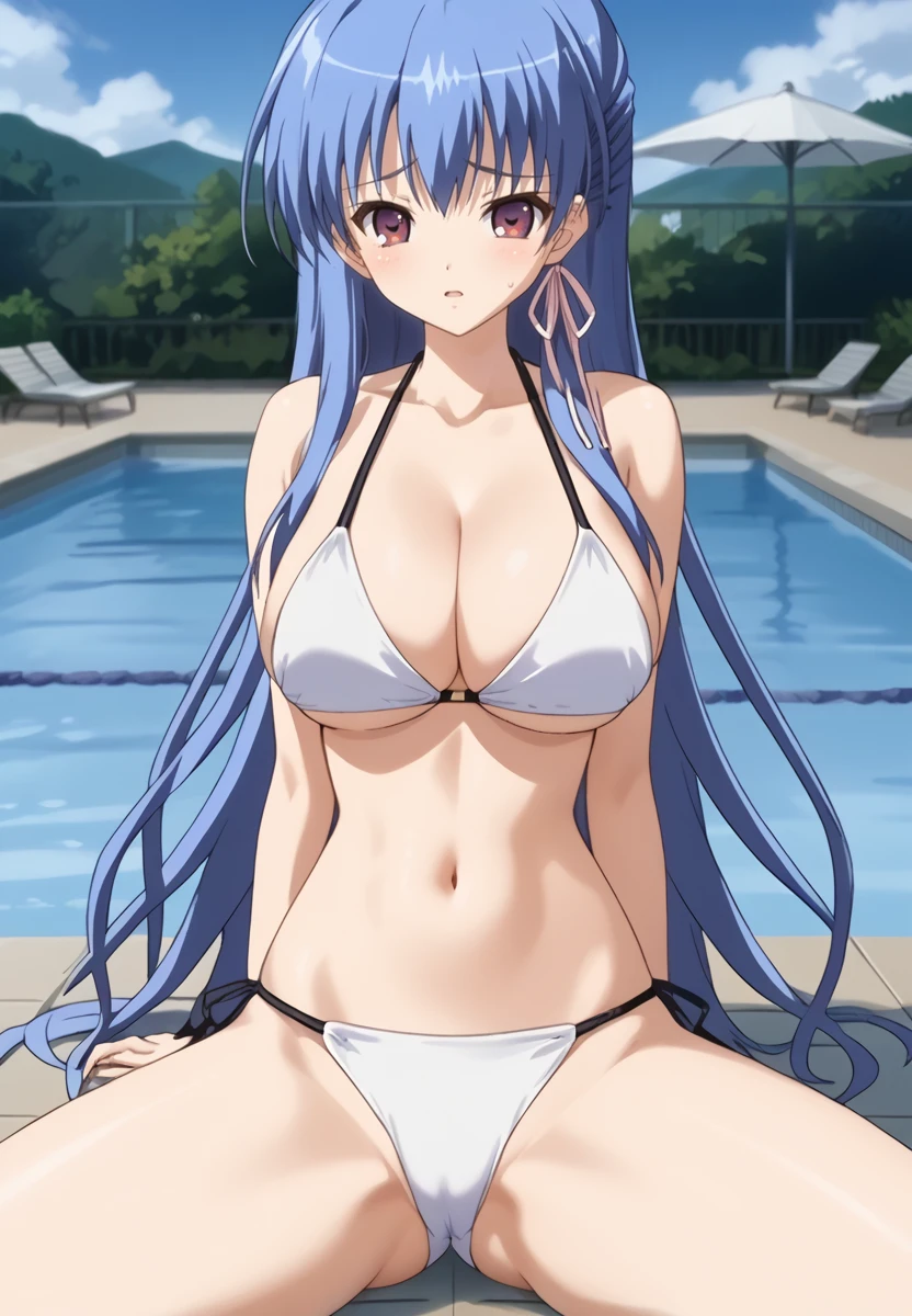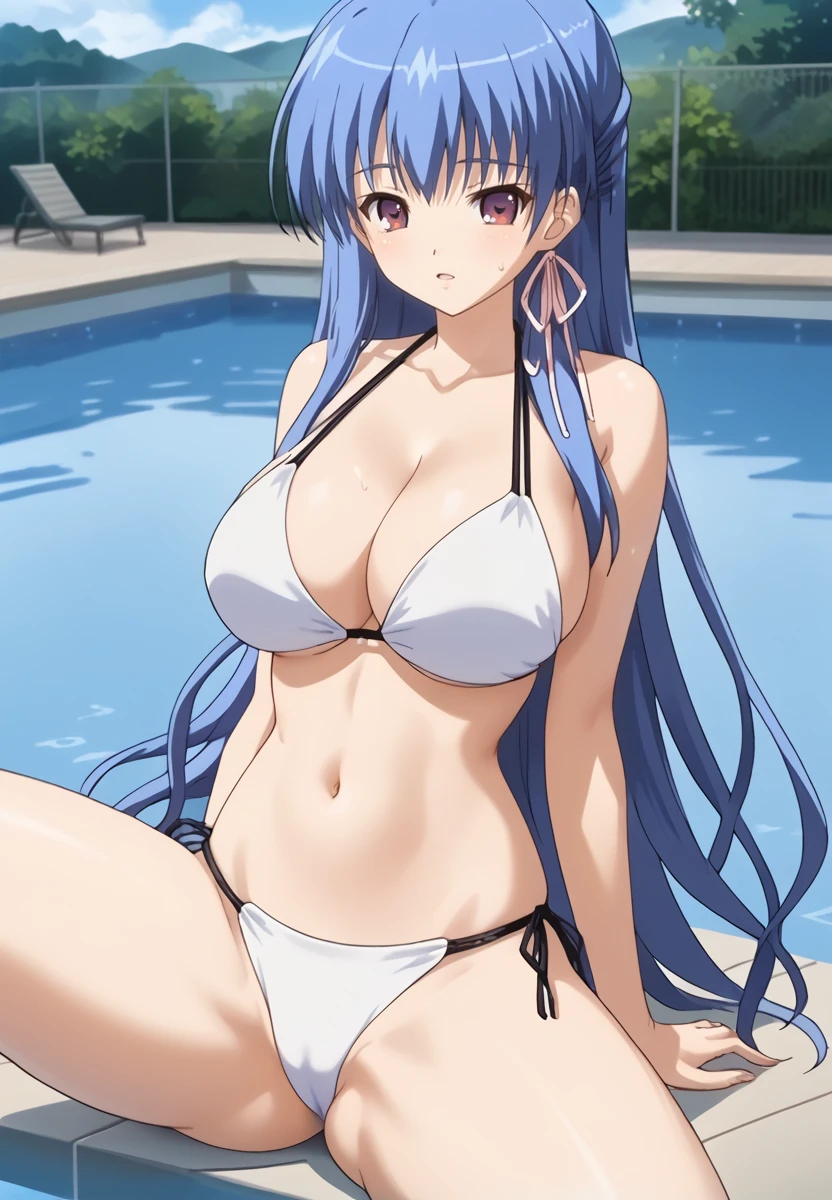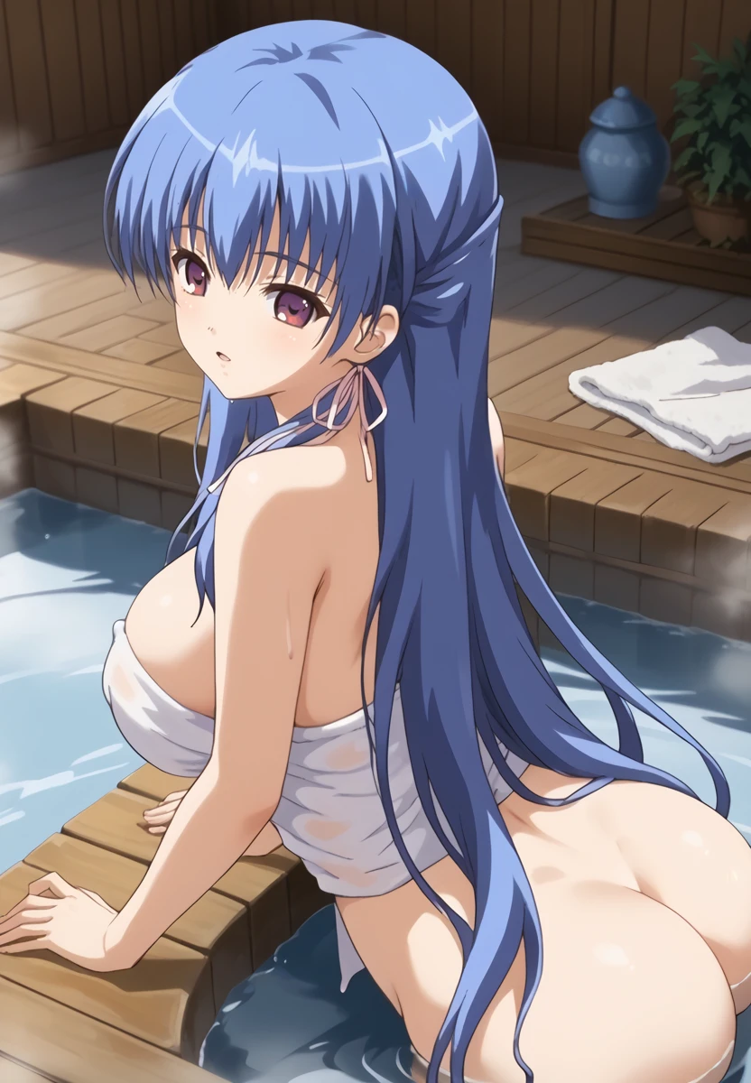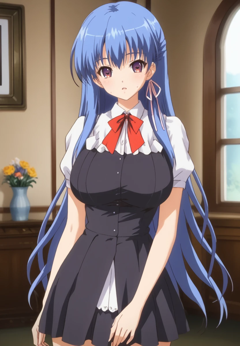 Prompt: kuonji otoha, 1girl, blue hair, long hair, purple eyes, large breasts
