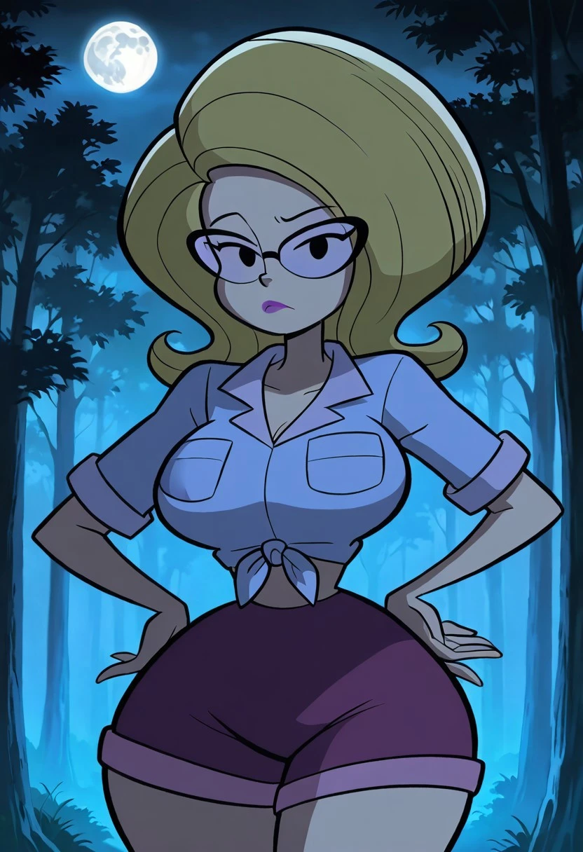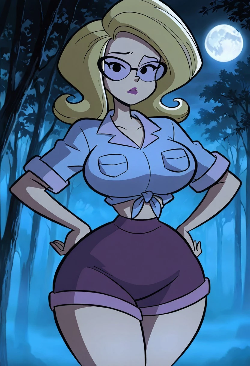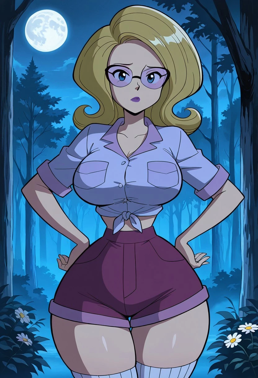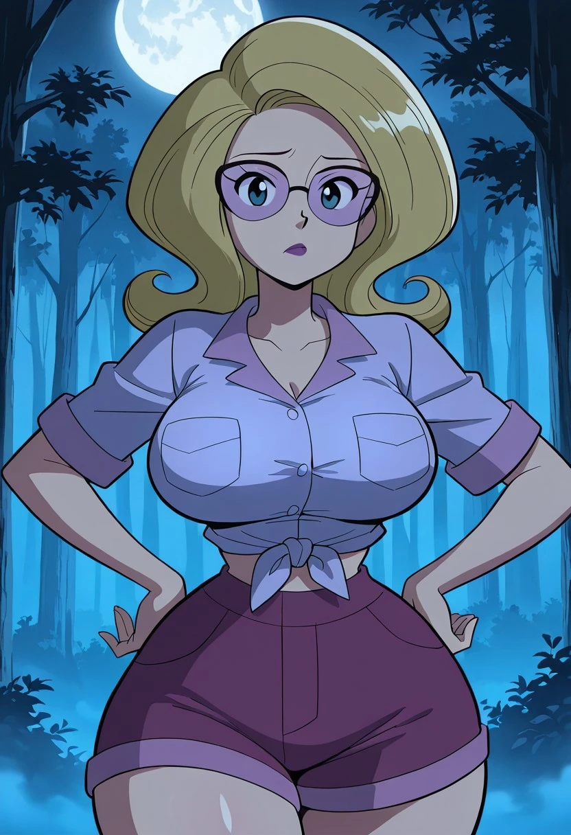 light purple midriff-baring, short sleeved Daisy Dukes-style knotted top, purple shorts, violent lens glasses, purple lipstick, long socks, brown shoes,