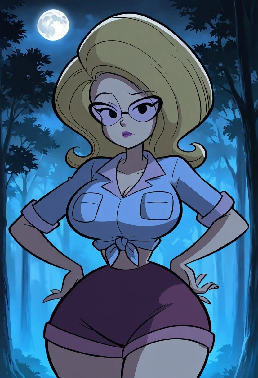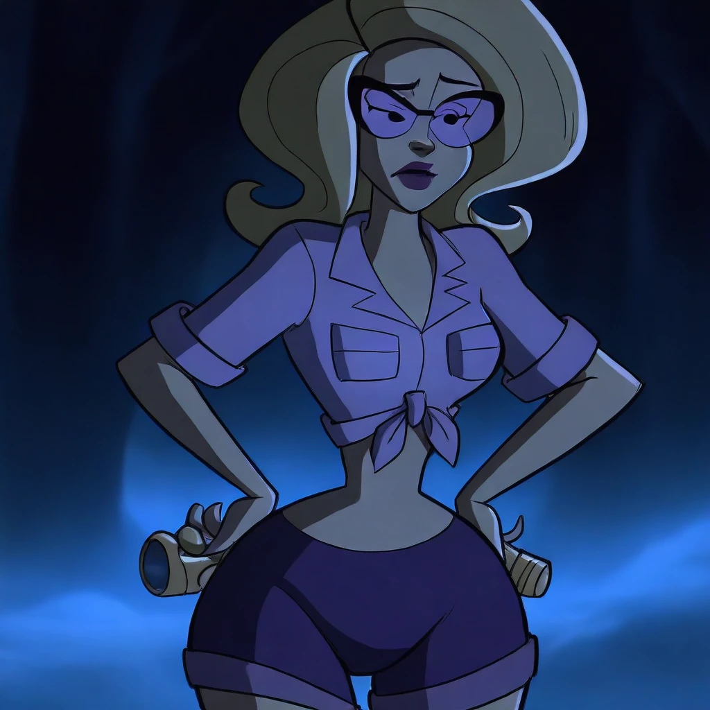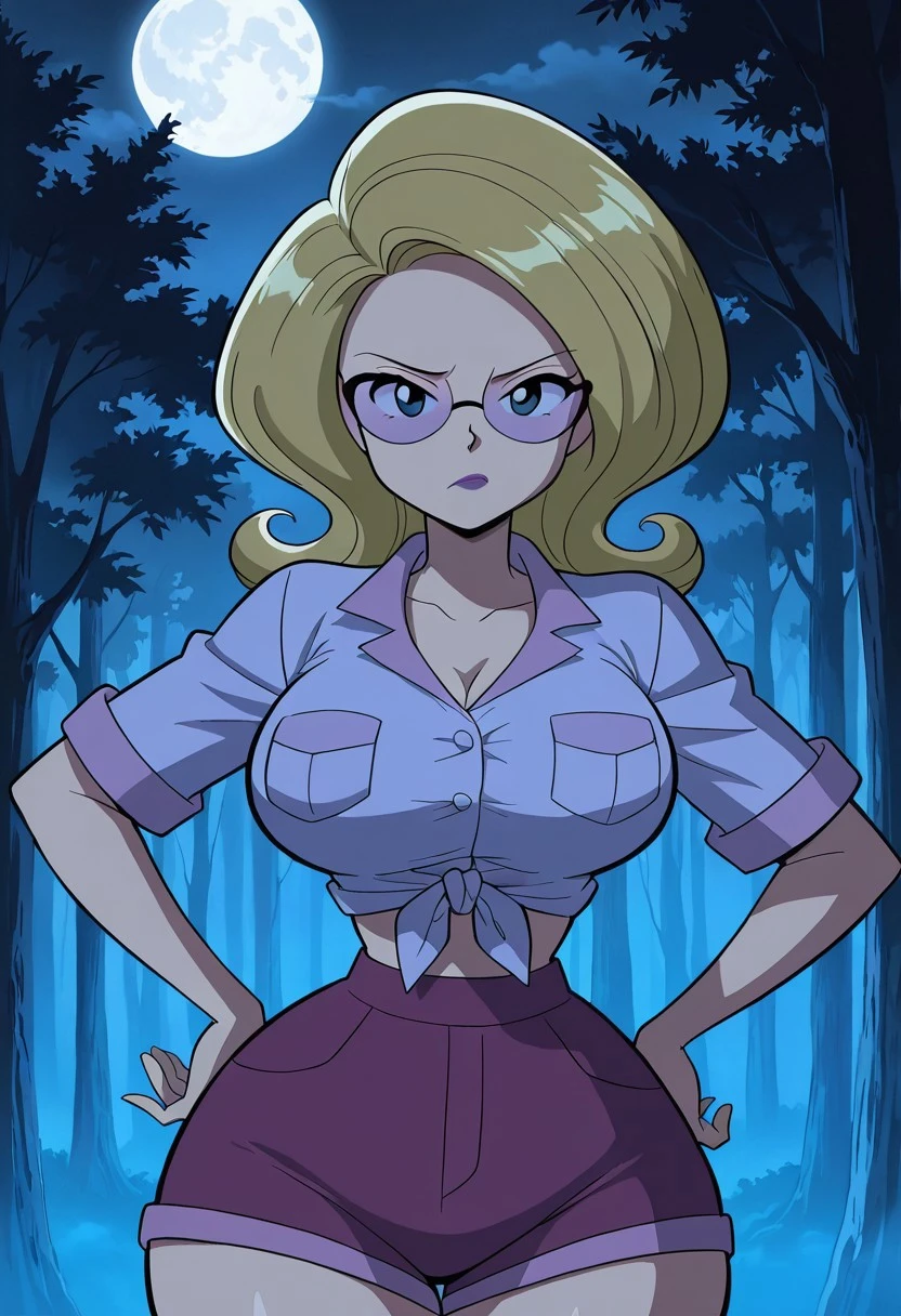 light purple midriff-baring, short sleeved Daisy Dukes-style knotted top, purple shorts, violent lens glasses, purple lipstick, long socks, brown shoes,