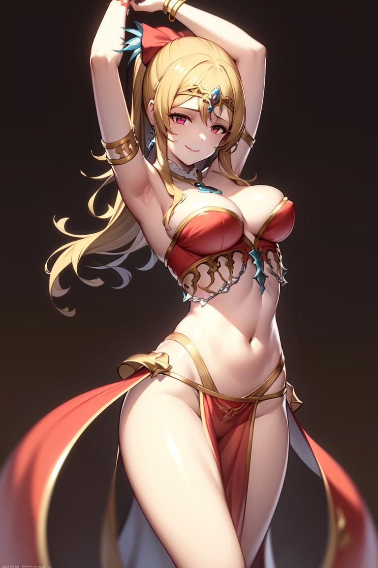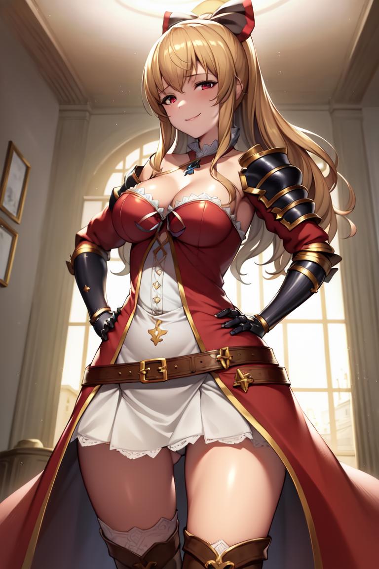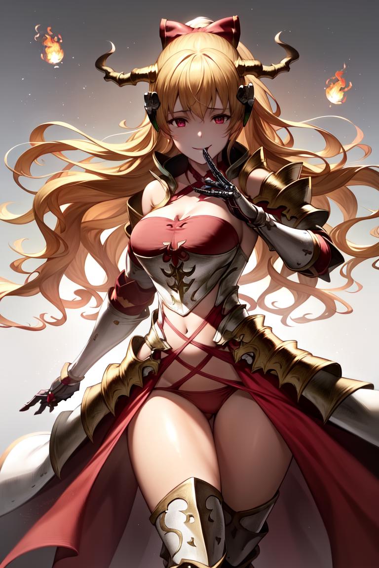 "ViraGrand, long hair, ponytail, red bow, bikini armor, armored, gloves, red panties, armored boots"
