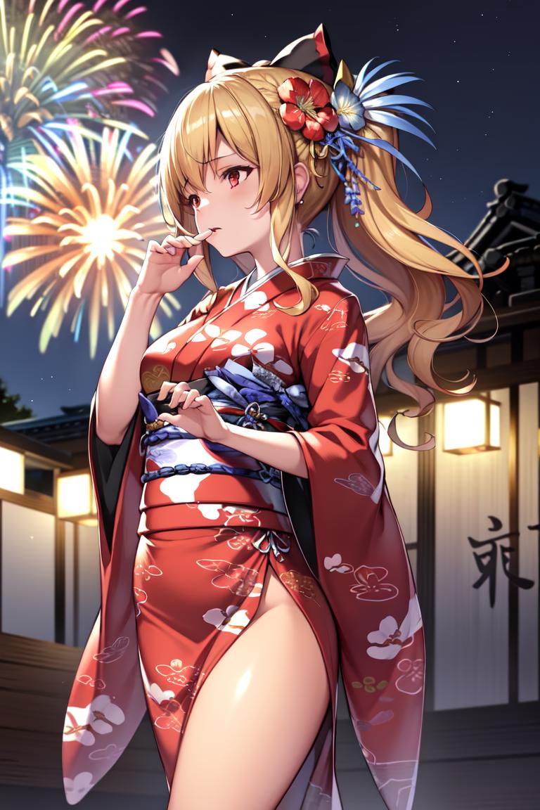 "ViraGB, long hair, ponytail, japanese clothes, hair flower, wide sleeves, red kimono, sash, black bow, obi, floral print"
