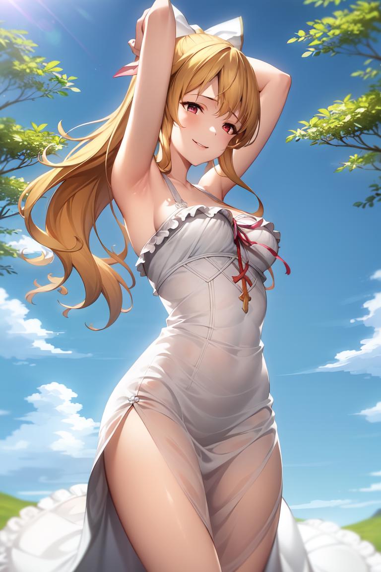 "ViraWind, long hair, ponytail, hair bow, white dress, ribbon, sleeveless dress"