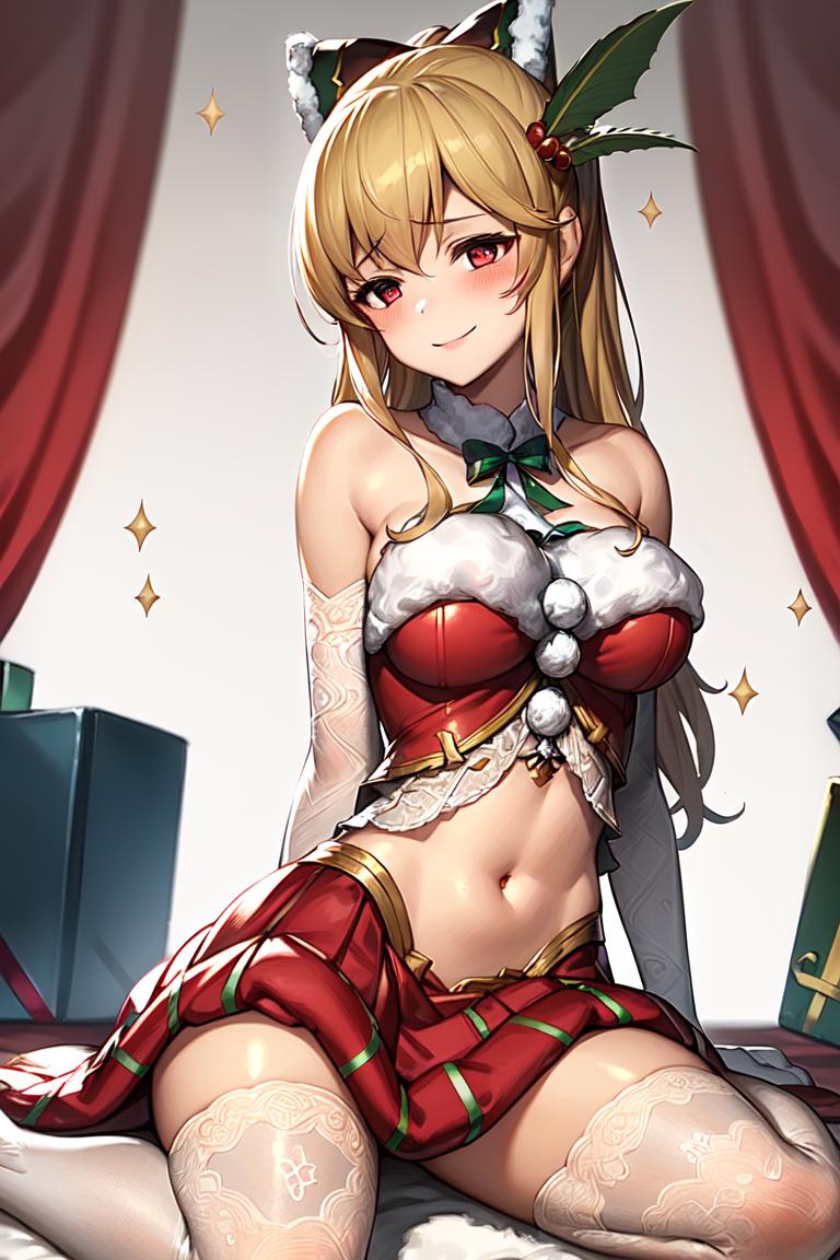 "ViraFestive, long hair, ponytail, hair bow, christmas, santa costume, midriff, white gloves, elbow gloves, red skirt, white thighhighs"