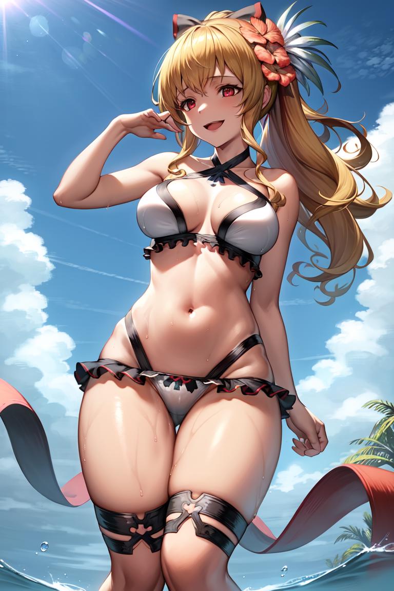 "ViraSummer, long hair, ponytail, black bow, hair flower, white bikini, halterneck, frills, cross-laced footwear"