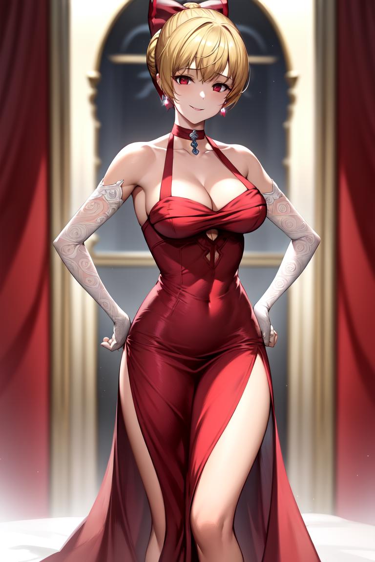"ViraPromo, short hair, hair bun, hair bow, cocktail dress, red dress, bare shoulders, earrings, elbow gloves, red choker"