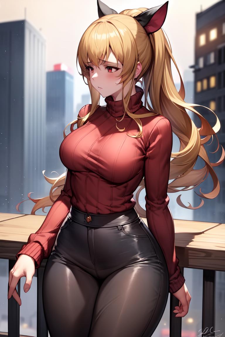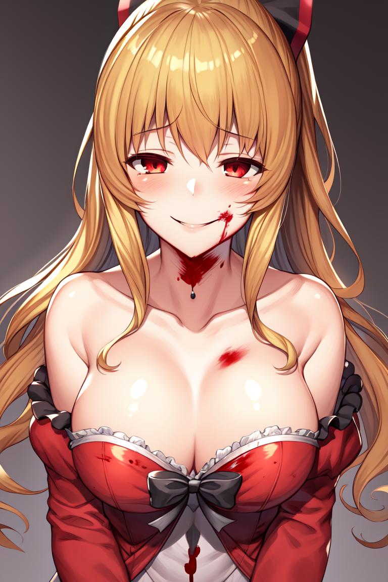 "ViraBase, long hair, ponytail, black bow, red dress, cleavage, gauntlets, ribbon, black thighhighs, shoulder armor, knee boots, belt"