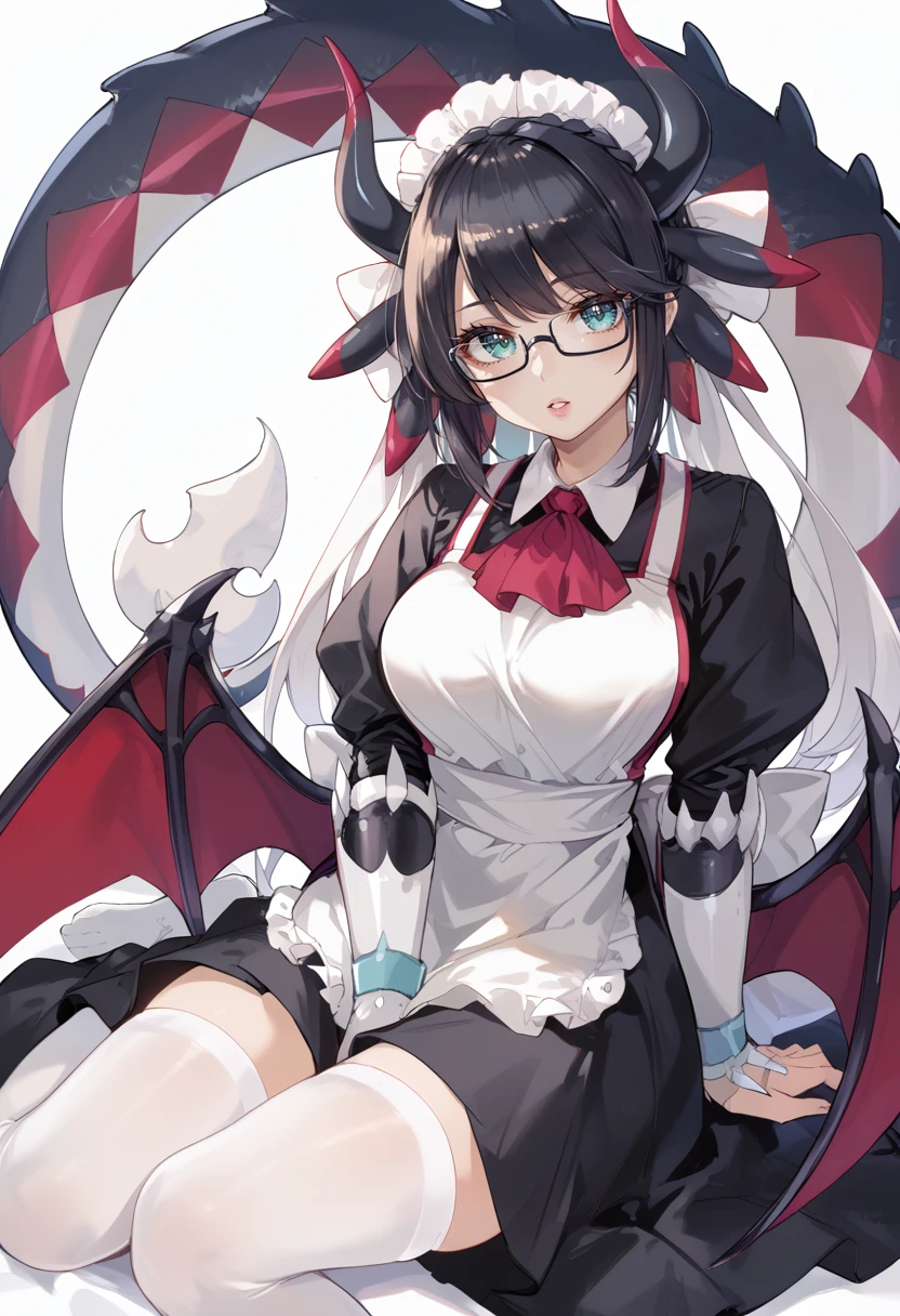 Tags (clothes): glasses, maid headdress, maid dress, red ascot, low dragon wings, silver fingerless gloves, mob cap