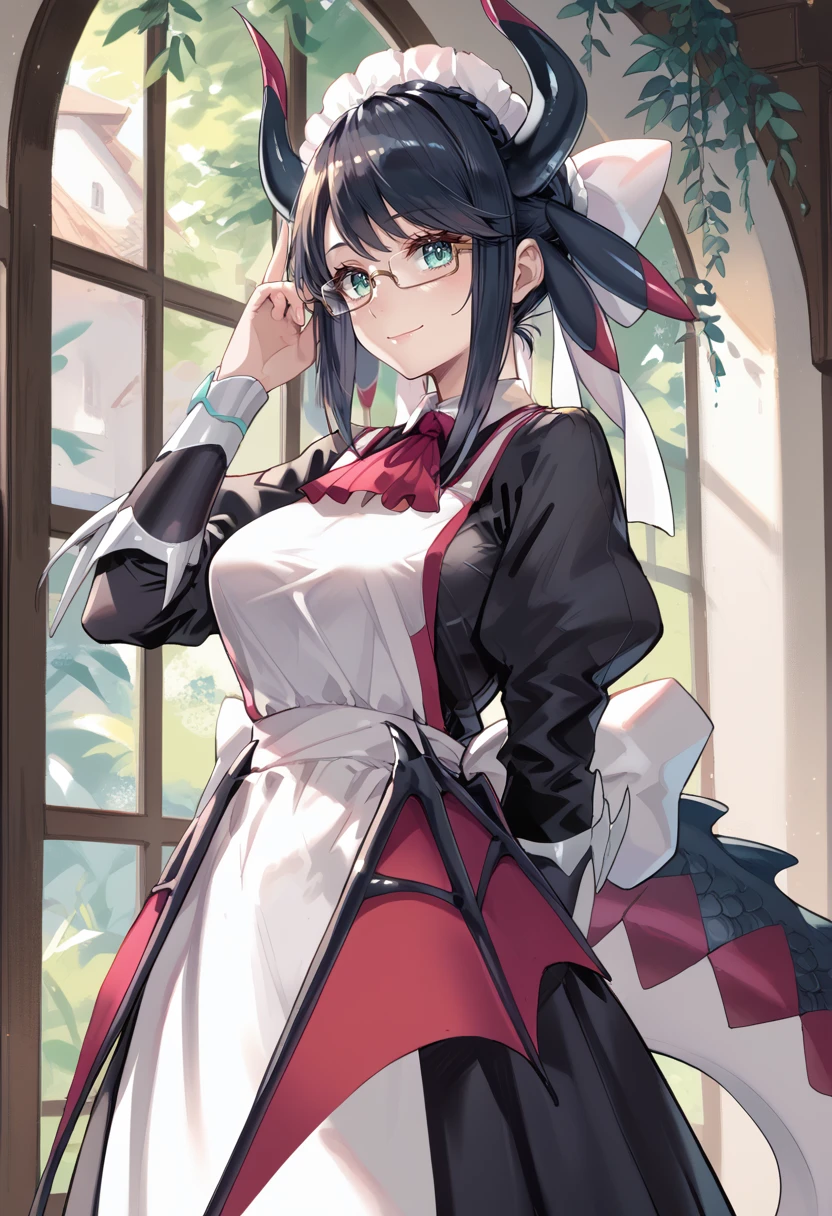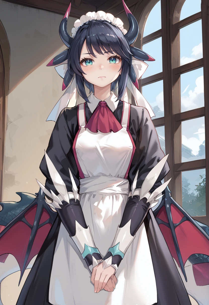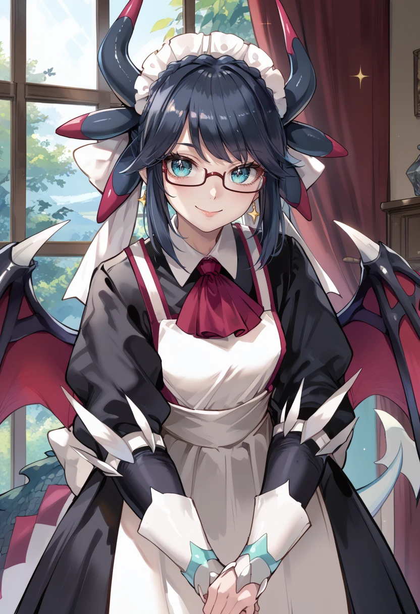 Tags (clothes): black under-rim eyewear, black maid dress, red ascot, low dragon wings, white mob cap, silver vambraces, black claw boots