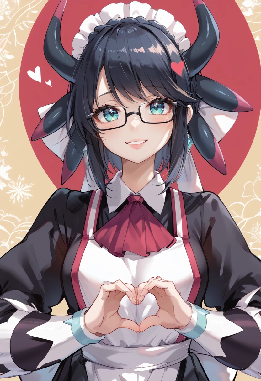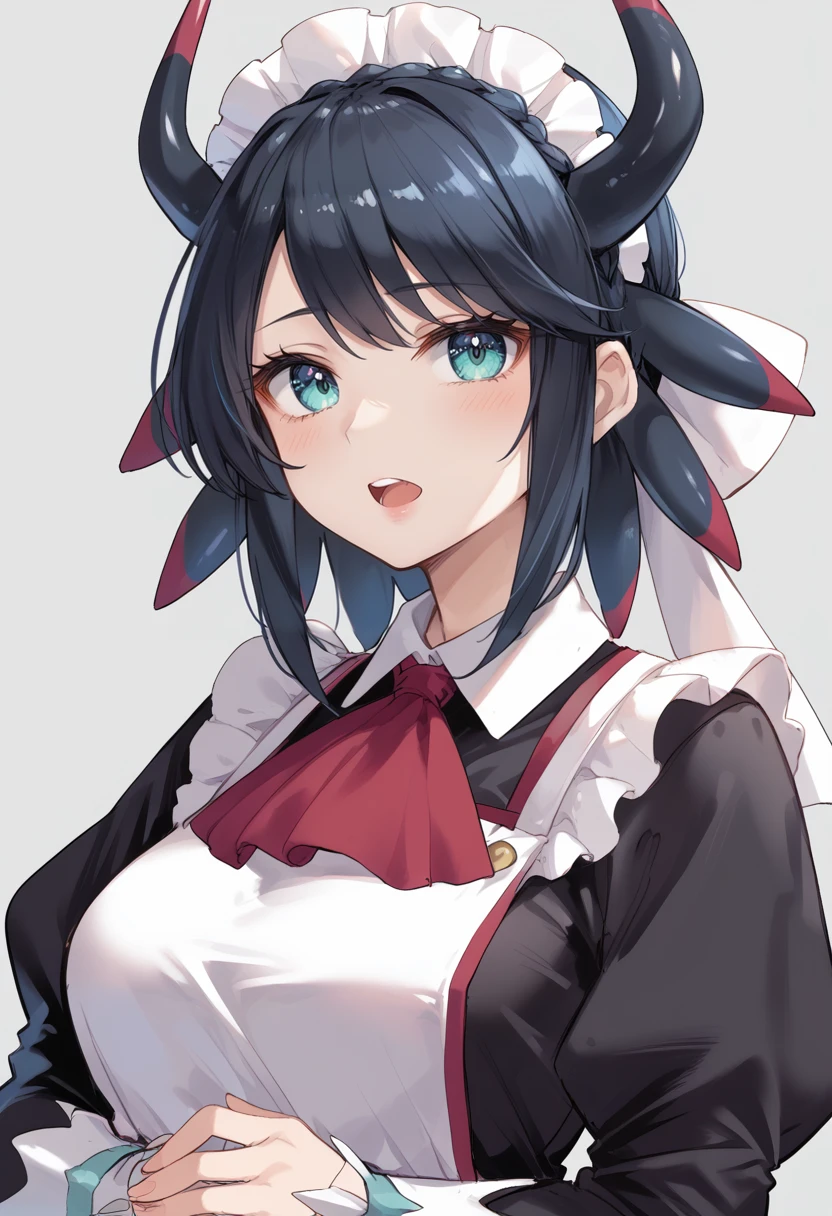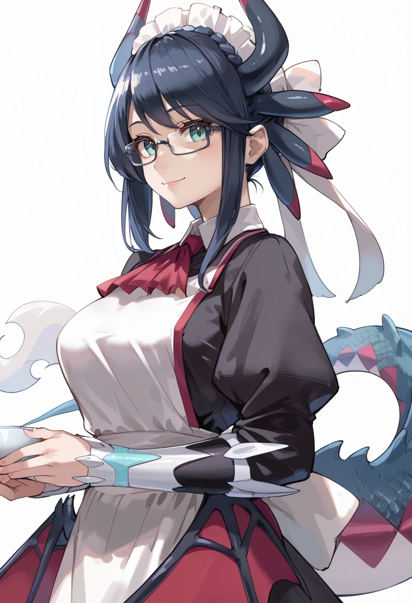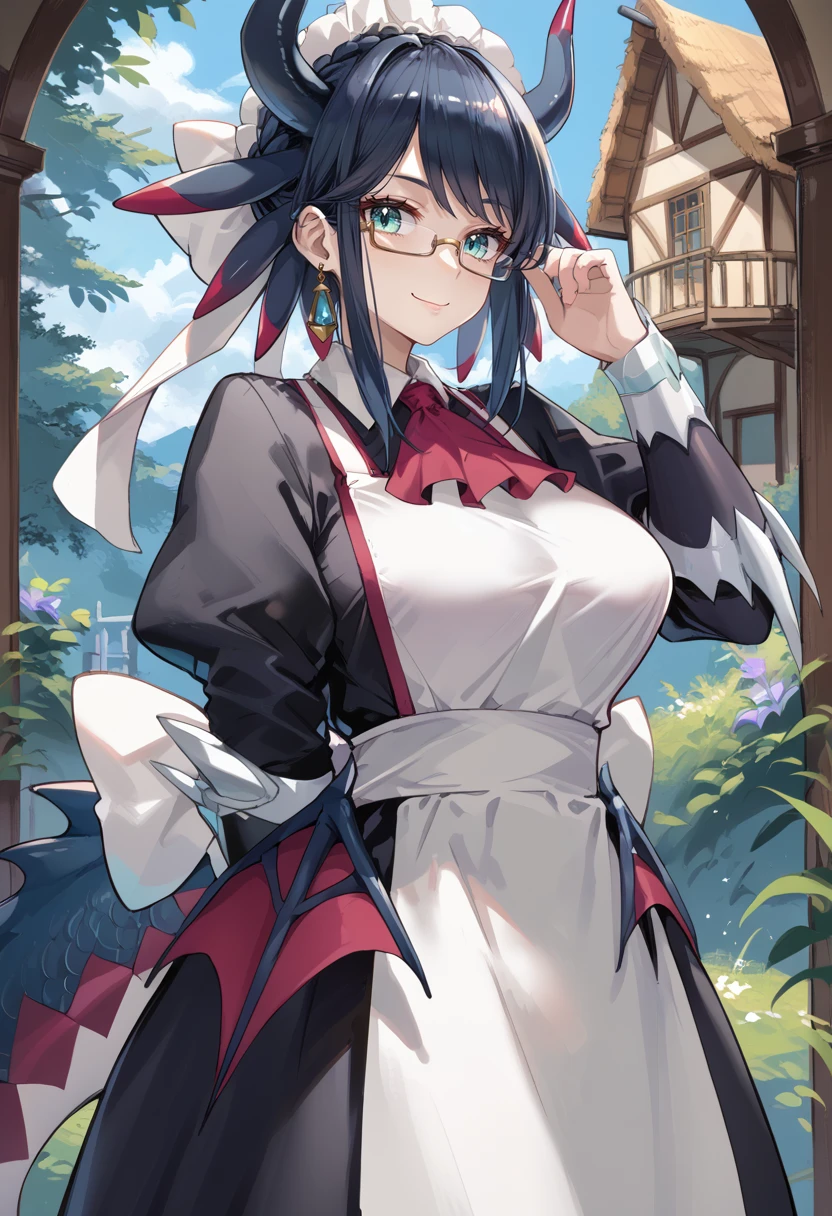 Tags (clothes): black under-rim eyewear, black maid dress, red ascot, low dragon wings, white mob cap, silver vambraces, black claw boots