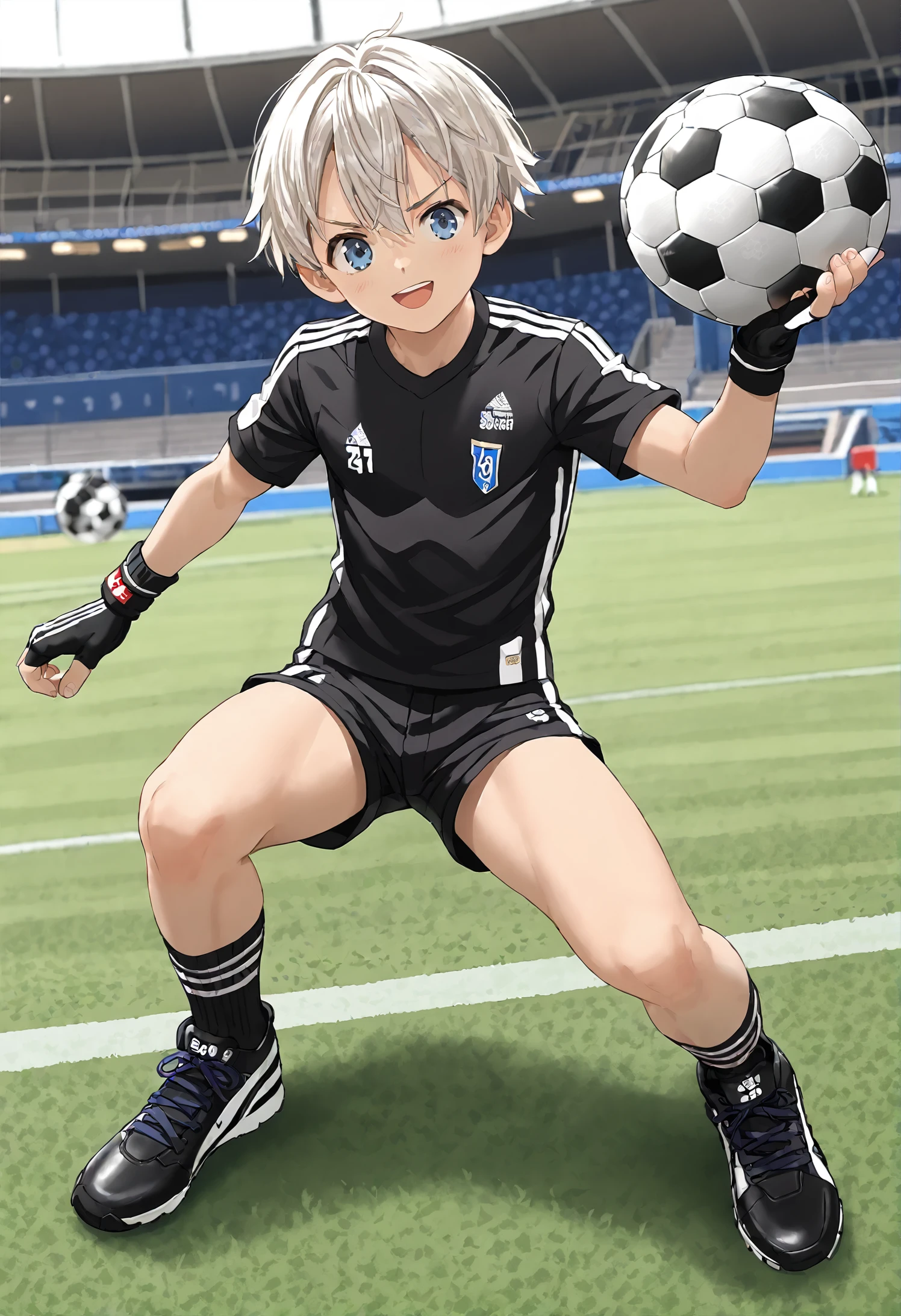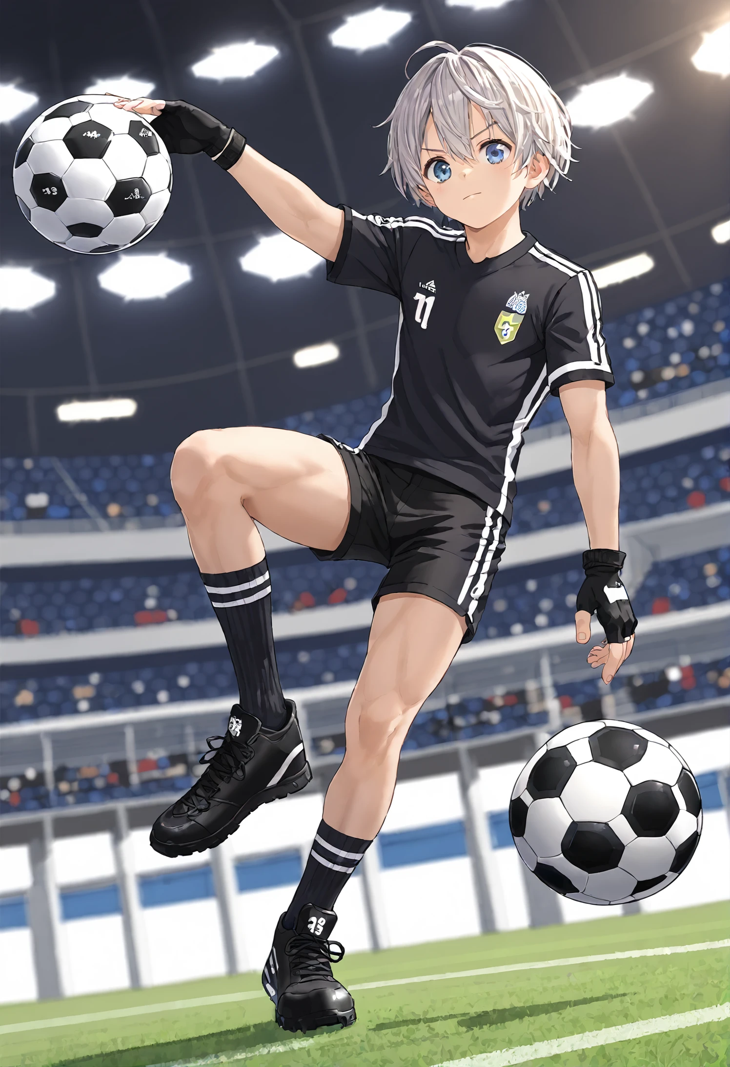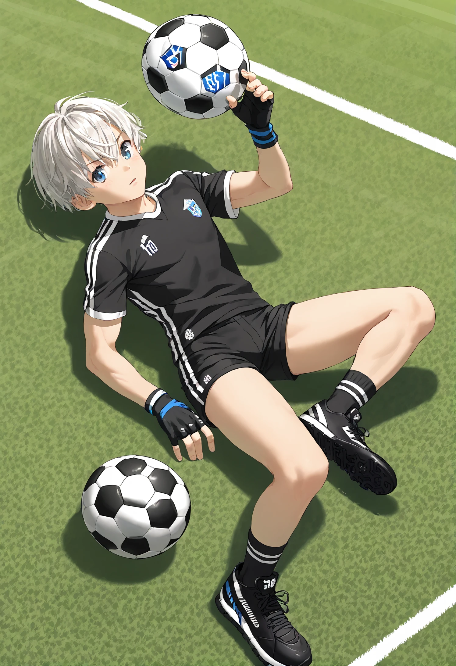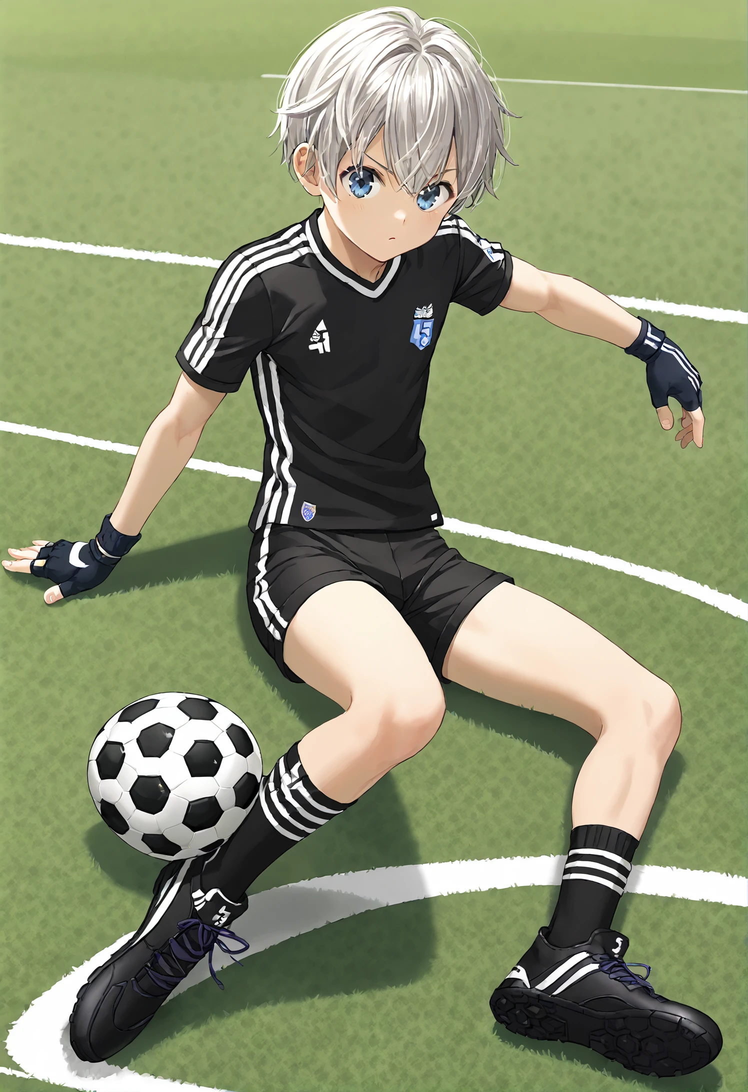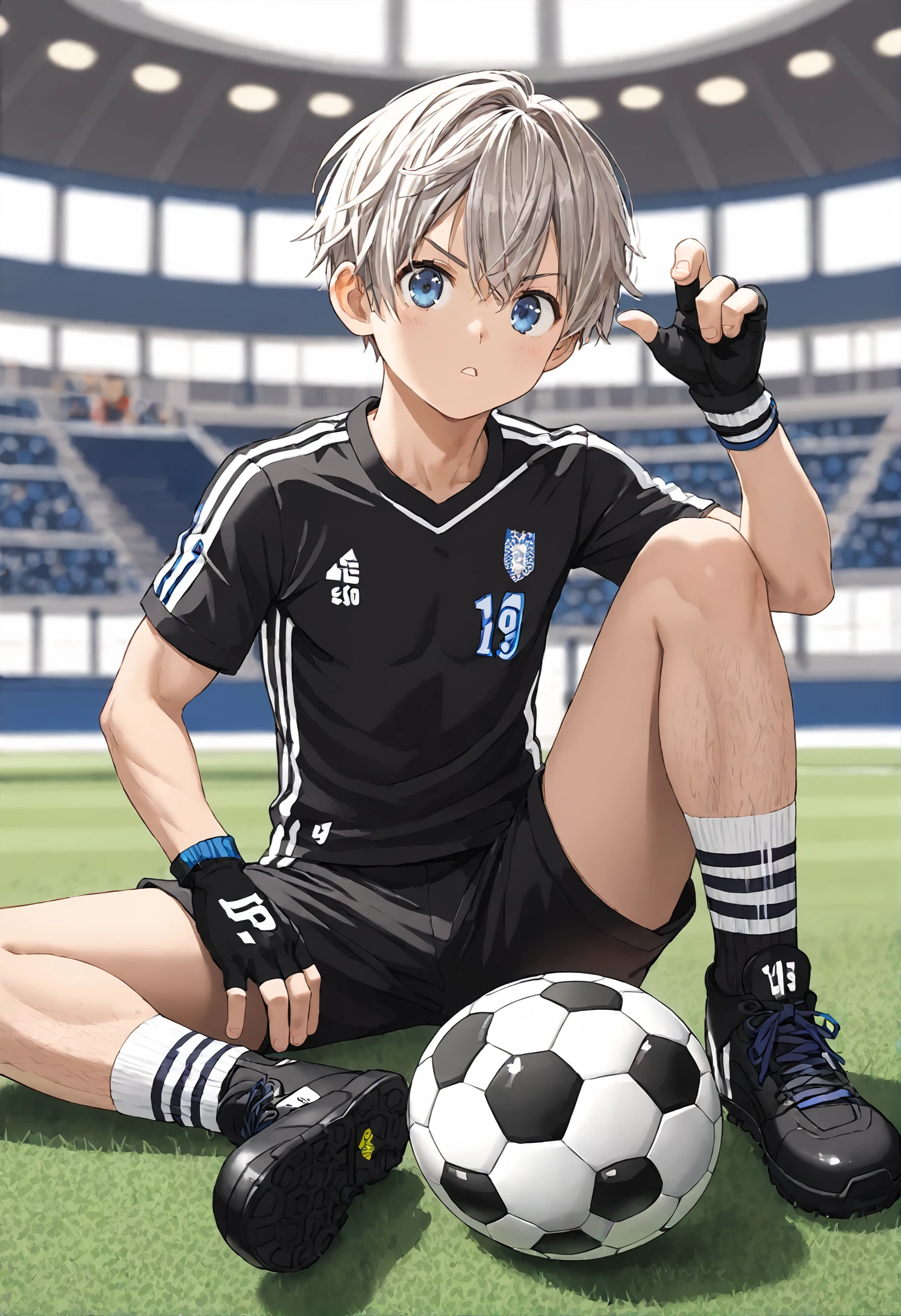 soccer uniform, short sleeve shirt, fingerless gloves, short shorts, long soccer socks, sneaker,