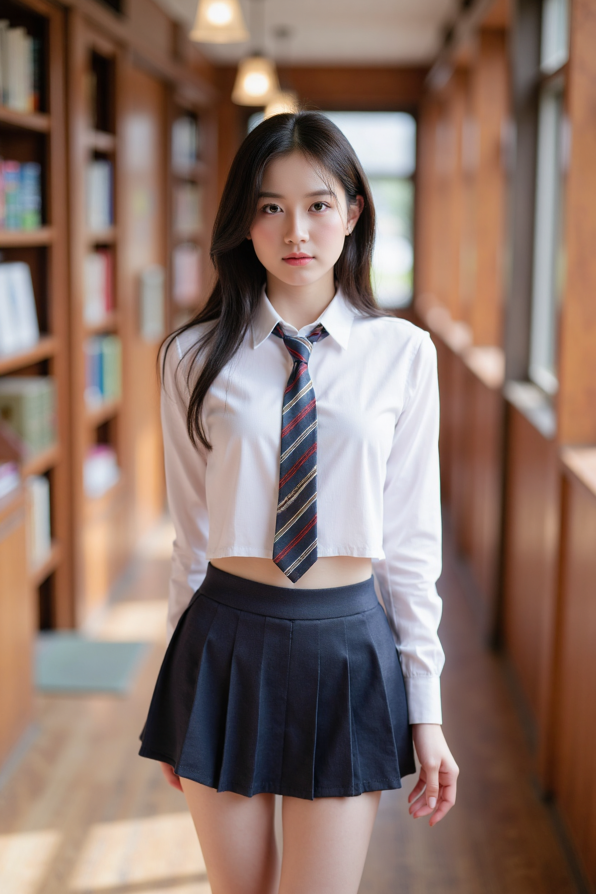 A sexy office woman wearing a fitted white button-down shirt slightly unbuttoned at the top, tucked into a tight black pencil skirt that ends mid-thigh, standing in a sleek, modern office with large glass windows and a view of the city skyline, , GHUN, sheer pantyhose and black stilettos completing the look, crisp textures on her shirt and skirt with realistic indoor lighting and polished floor reflections.