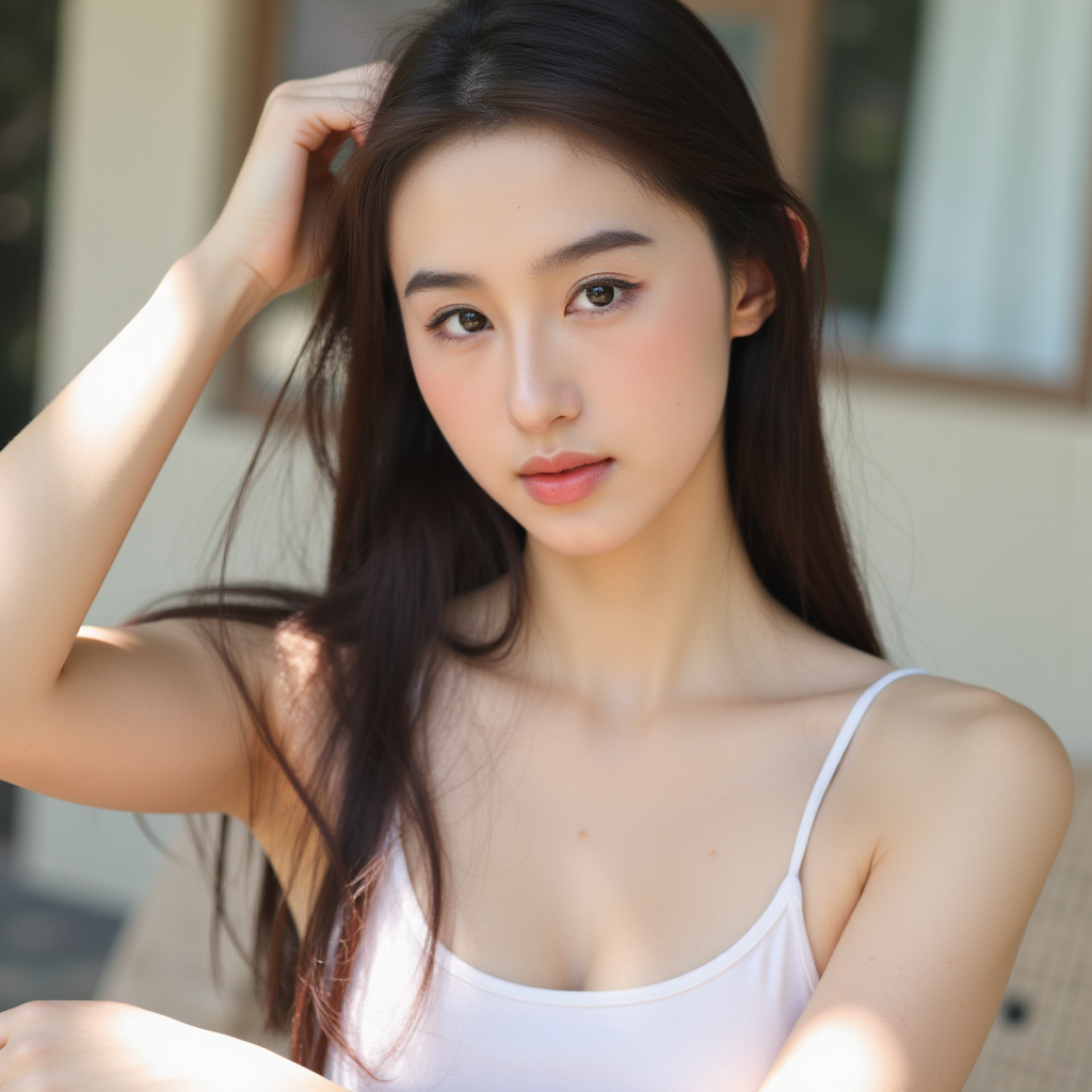 A young woman standing behind a counter in a bright, modern café, wearing a navy-blue polo shirt paired with a dark denim apron with leather straps. Her hair is tied back in a casual ponytail, and she gazes confidently at the camera with a soft smile. The background features shelves stocked with neatly arranged cardboard boxes and a clean, minimalistic aesthetic. The glass counter in the foreground reflects soft lighting, adding a sense of depth and clarity. Realistic, ultra-realistic, photorealistic, 8K resolution, UHD, High detail, intricate details, hyper-detailed, sharp focus, Unreal Engine, Octane Render, Depth of field, cinematic lighting, HDR.