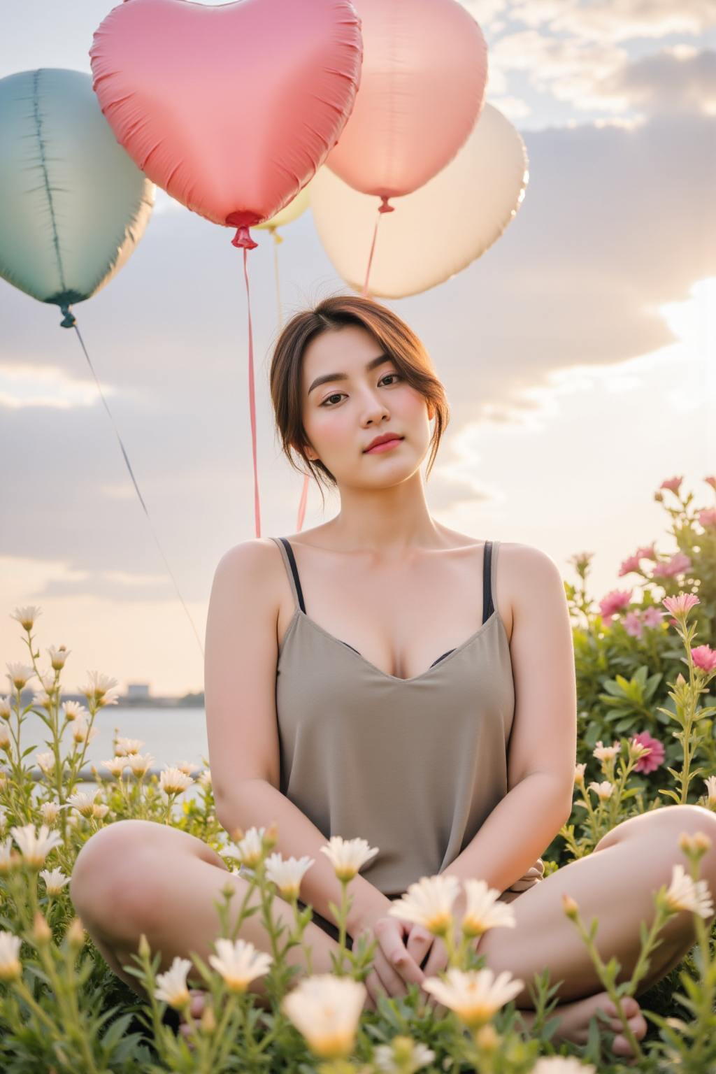 A charming young woman with smooth, fair skin and straight, shoulder-length dark brown hair. She is wearing a silky grey lace nightgown with intricate lace details along the neckline and hem. She smiles softly while winking, standing near a sheer white curtain with natural sunlight streaming through. The background features a potted green plant and minimalistic indoor decor, creating a cozy and serene atmosphere.