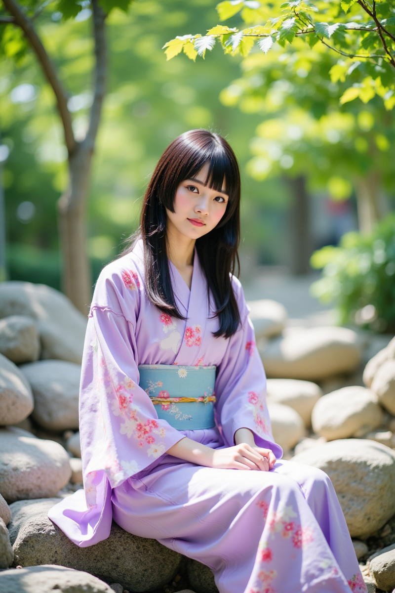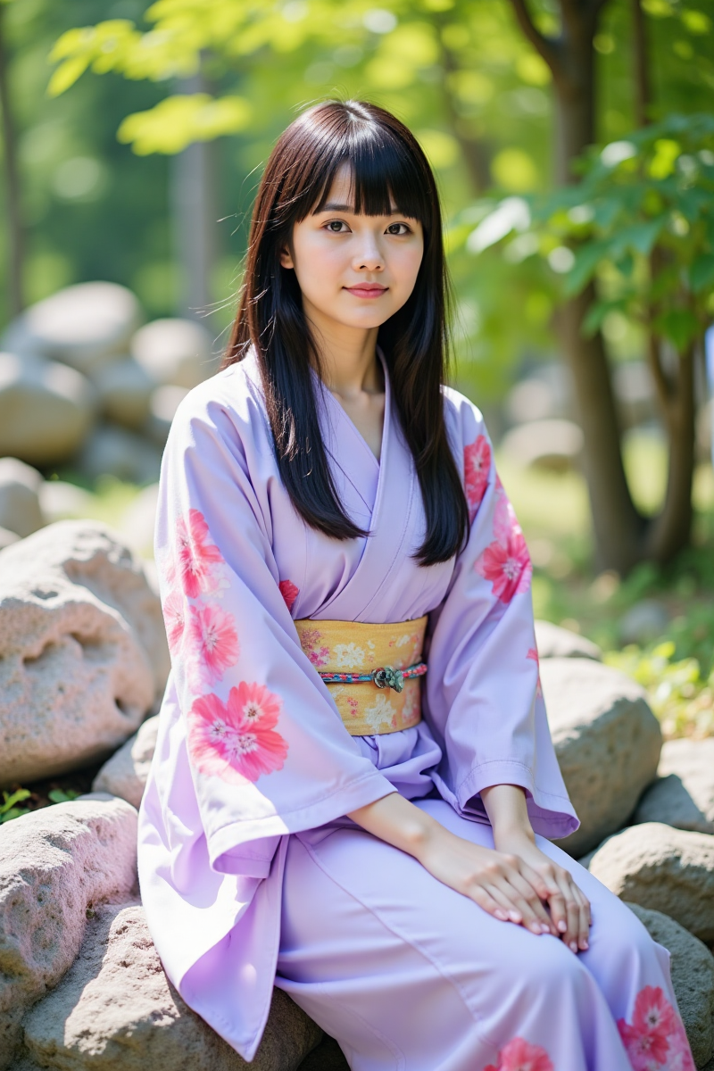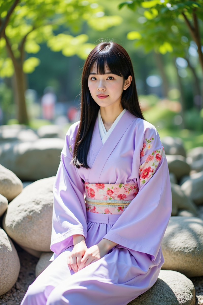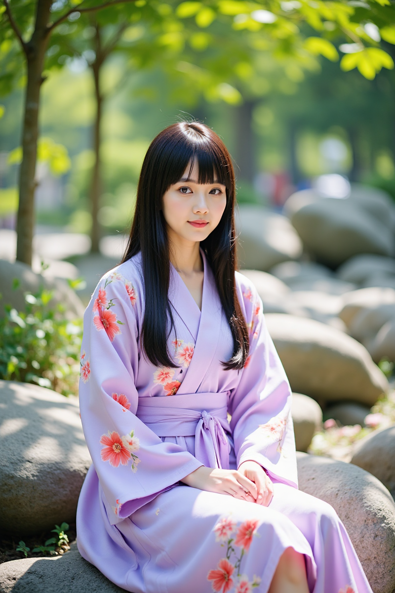 luongthuykhe,A young Asian woman,likely in her late teens or early twenties,is seated on rocks outdoors. She is wearing a traditional Japanese Yukata,a light purple/lavender kimono with a vibrant pink floral pattern. Her hair is long,straight,and black,styled with bangs. Her expression is calm and serene,with a neutral facial expression. She is of slender build. Her posture is relaxed and natural,sitting with her legs slightly bent,hands resting on her lap. The environment is a park-like setting with various rocks,greenery,and trees. The sunlight filters through the leaves,creating dappled light and shadow on the ground and the woman. The setting suggests a peaceful,summery Japanese garden. The woman is positioned slightly to the left of center,facing the camera directly. The composition is relatively straightforward and uncluttered. The colors are pastel,with purples,pinks,greens,and grays. The overall atmosphere is relaxed and peaceful,evoking a sense of,