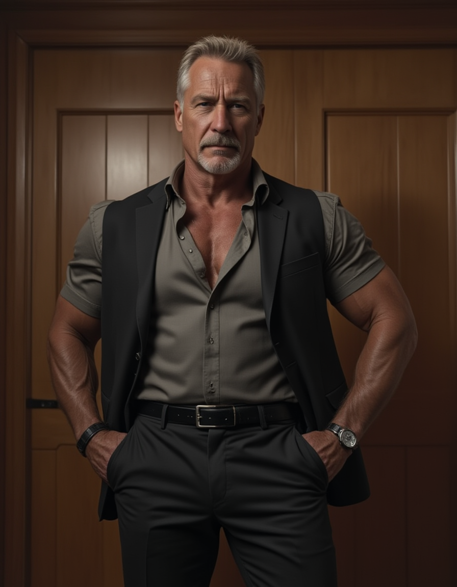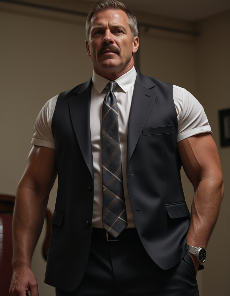 1boy, arm hair, bara, closed eyes, eurpolddad, looking at viewer, male focus, male underwear, manly, muscular, muscular male, mustache, old, on back, stomach, topless male, watch