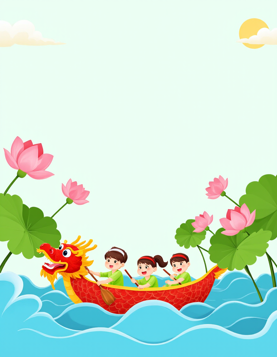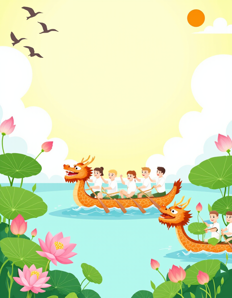 F1CNDuanwu, The image depicts a vibrant and festive scene with a dragon boat race taking place. The dragon boat is filled with people wearing traditional attire, paddling energetically. The boat is adorned with green leaves tied together, and there are two large, green dragon boats in the water. The dragon itself is a striking orange with intricate patterns and a fierce expression, adding a sense of dynamism to the scene. Surrounding the dragon boat race are lush, colorful elements. There are lotus flowers in various stages of bloom, their petals ranging from soft pink to deep orange. Large green leaves and stems are scattered throughout the scene, creating a natural and serene backdrop. The sky is a gradient of light yellow and white, with fluffy clouds and a setting or rising sun casting a warm glow over the entire scene. In the background, there are three birds flying, their silhouettes adding a sense of movement and freedom to the composition. The overall atmosphere is one of celebration and harmony, with the natural elements complementing the lively and joyful event depicted.