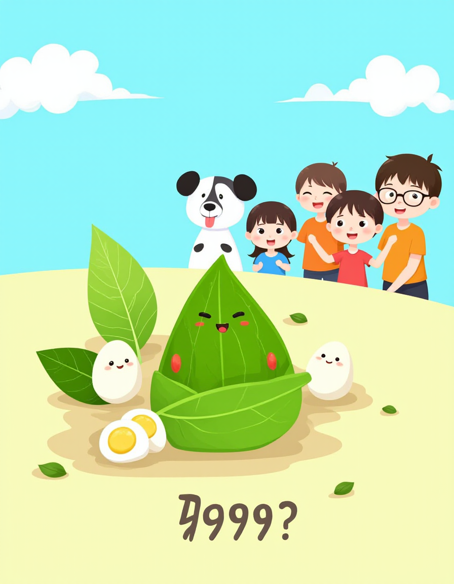 F1CNDuanwu, The image depicts a colorful and playful scene with a group of cartoon characters. In the foreground, there is a large green leaf with a smiling face, resembling a traditional Thai banana leaf used for wrapping food. Nearby, there are two boiled eggs with a slit in the middle, and a small green leaf with a smile. In the background, there are three children, two of whom are wearing glasses and one in an orange shirt, all appearing excited and happy. The sky is a bright blue, and there are a few white clouds. The word "?????" is written at the bottom of the image in stylized text.
