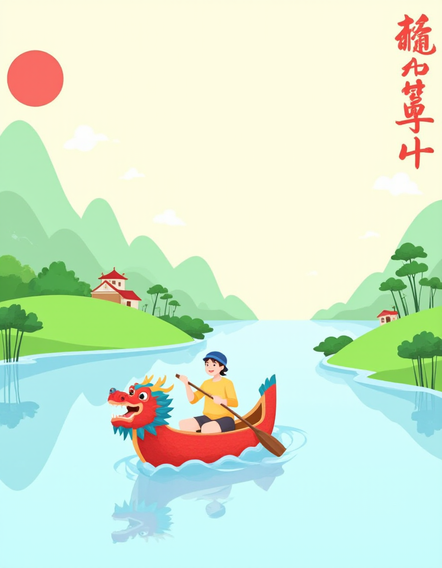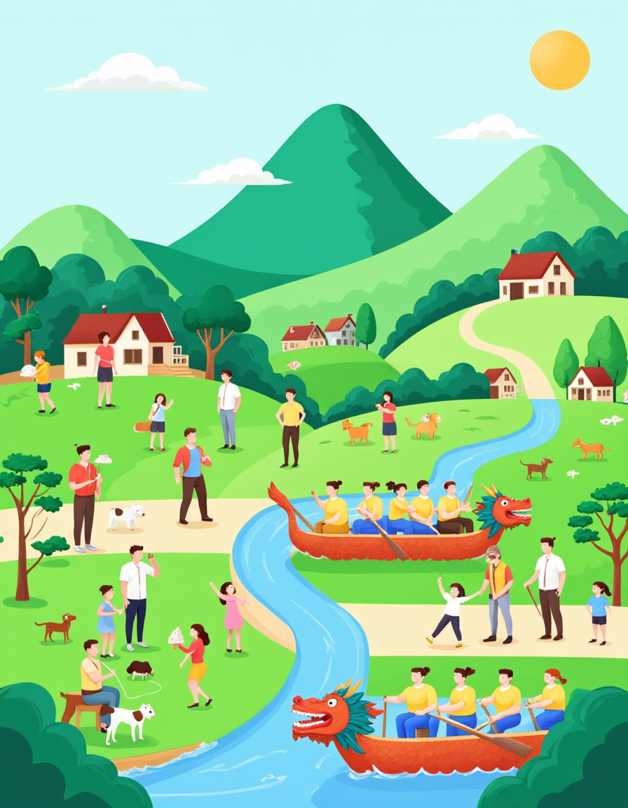 F1CNDuanwu, The image depicts a vibrant and colorful scene with a focus on a dragon boat festival. In the foreground, there are two dragon boats with people paddling in unison, each boat adorned with a dragon head. The paddlers are wearing yellow shirts, and the boats are decorated with traditional dragon motifs. In the middle ground, there is a lush, green landscape with rolling hills and small houses with red roofs. People are engaged in various activities: some are walking, others are playing, and a few are interacting with animals, such as a horse and a dog. There are also trees scattered throughout the scene, adding to the natural beauty. In the background, there is a large mountain with a small village at its base. The sky is light blue with a few fluffy clouds, and a large sun is visible, suggesting a bright and sunny day. The overall atmosphere is cheerful and festive, capturing the essence of a community celebration.