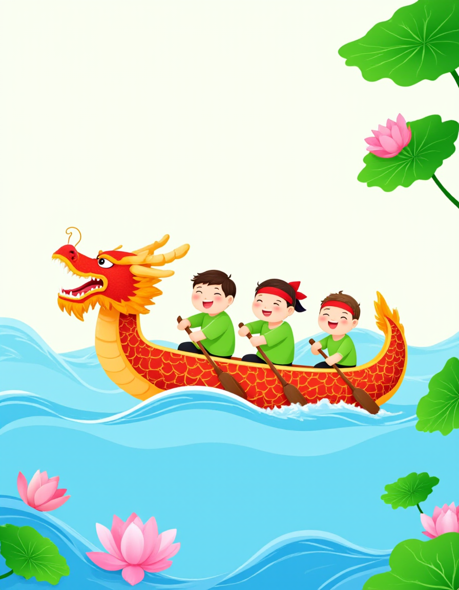 F1CNDuanwu, The image depicts a vibrant and colorful scene of a dragon boat race. At the forefront is a dragon boat adorned with a bright red and gold dragon head, its scales shimmering with intricate patterns. The boat is filled with three cheerful participants wearing green outfits and red headbands, each holding paddles and appearing to be actively rowing. The background features lush green lotus leaves and blooming pink lotus flowers, adding a natural and serene atmosphere to the scene. The water is depicted with dynamic waves, suggesting movement and energy. The overall composition is lively and festive, capturing the essence of a traditional Chinese dragon boat race.