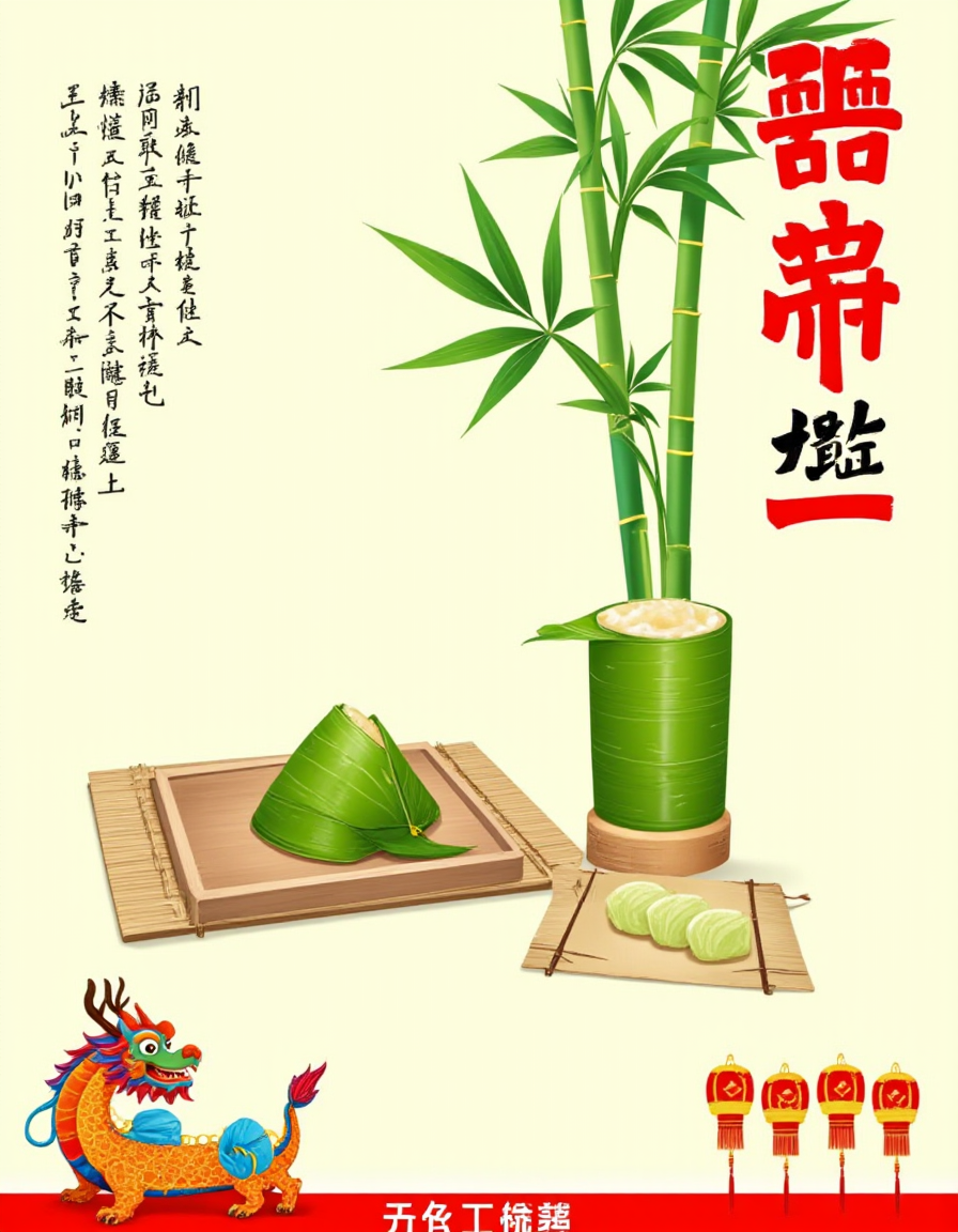 F1CNDuanwu, The image depicts a vibrant and colorful scene with a dragon intricately woven into a traditional Chinese design. The dragon is depicted in shades of blue, orange, and green, with its head raised and mouth open, as if it is about to eat or playfully interact with the scene. The dragon's body is coiled around a large, white, round object that resembles a dumpling, which is decorated with colorful toppings. Surrounding the dragon and dumpling are various elements of nature, including lotus flowers in full bloom, green leaves, and flowing water that creates a sense of movement and dynamism. The background is a soft, pastel gradient, giving the image a serene and festive atmosphere. The overall composition is harmonious and visually appealing, blending traditional Chinese motifs with natural elements in a stylized manner.