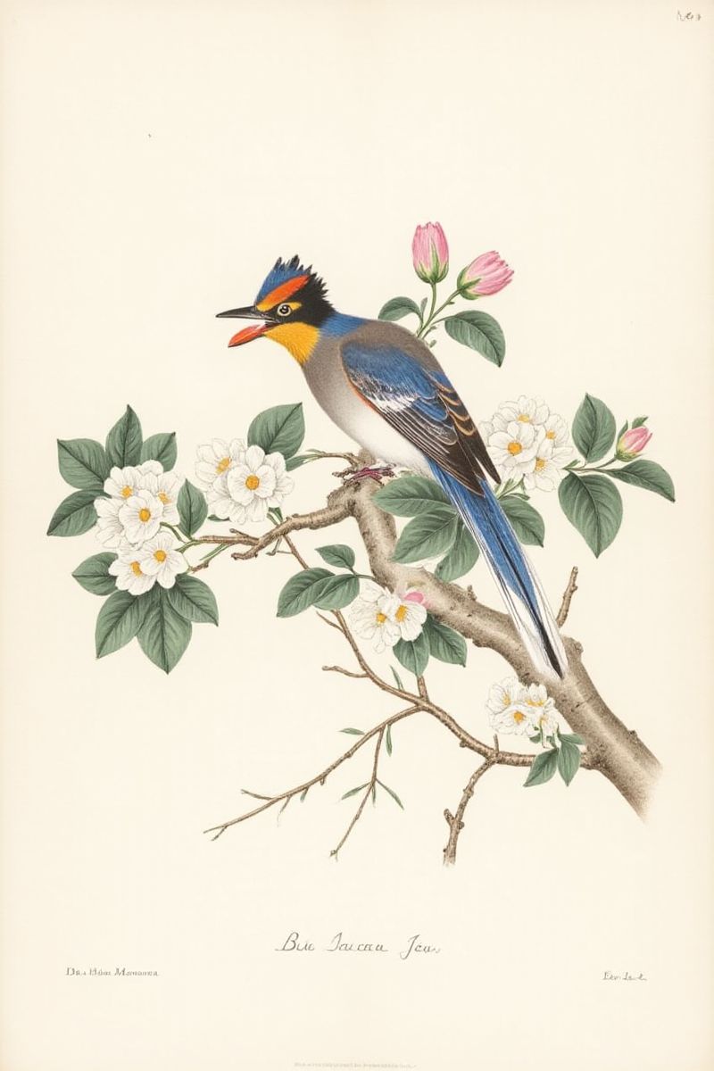 F1CNZQYHN, a detailed painting of a blue jay bird perched on a branch. The bird is facing towards the right side of the image, with its wings spread wide. Its beak is a bright orange, with a yellow stripe in the center of its head. Its wings are a dark brown, while its tail is a lighter blue. The branch it is perched on is a light brown color, with dark green leaves surrounding it. There are white and pink flowers on the branch, adding a pop of color to the scene.