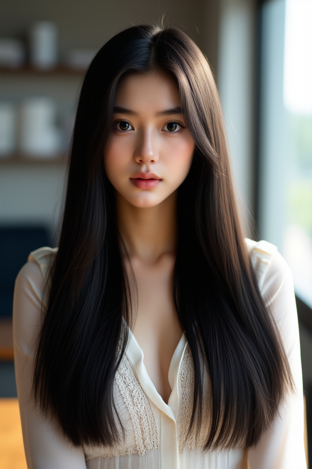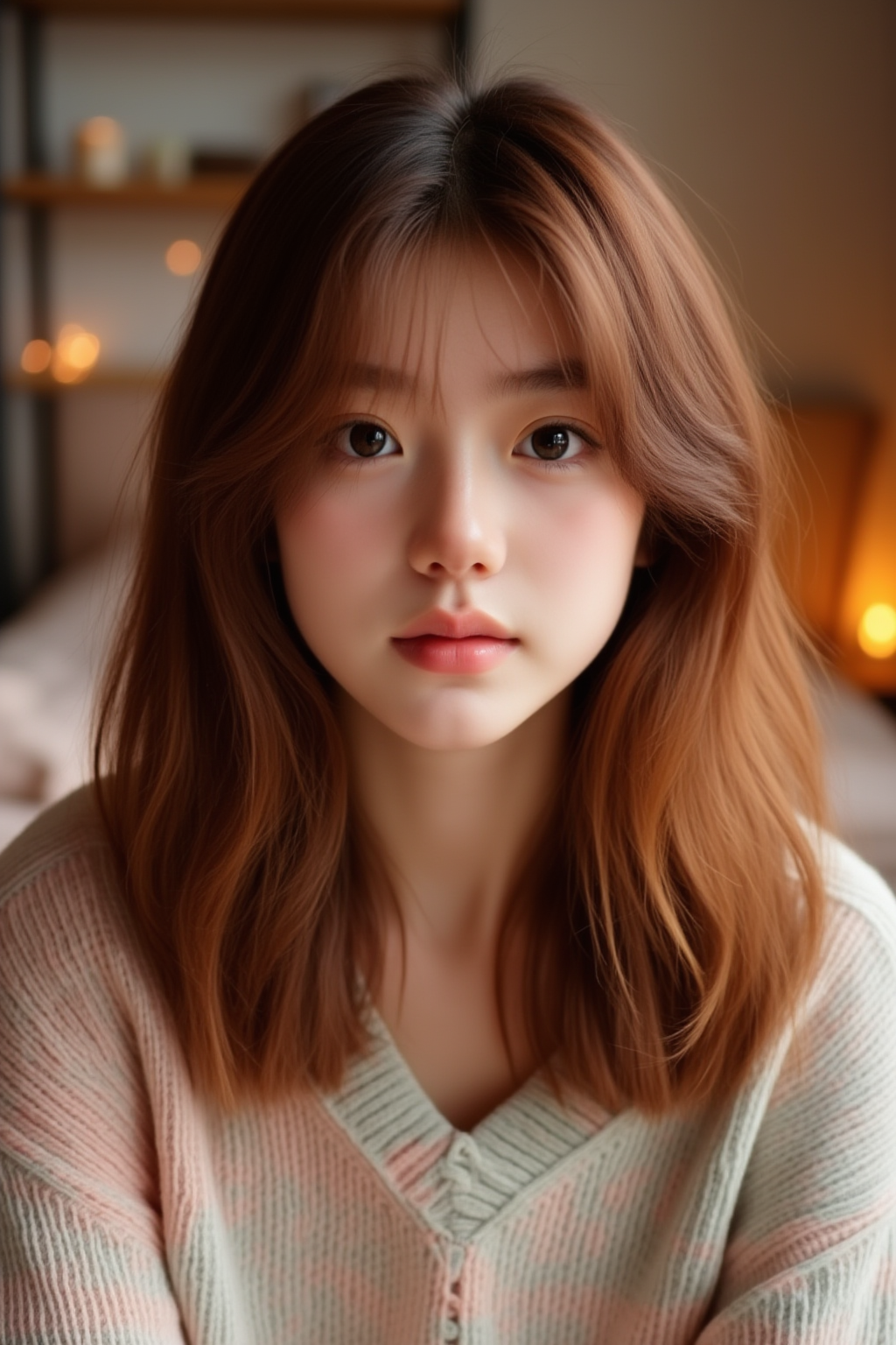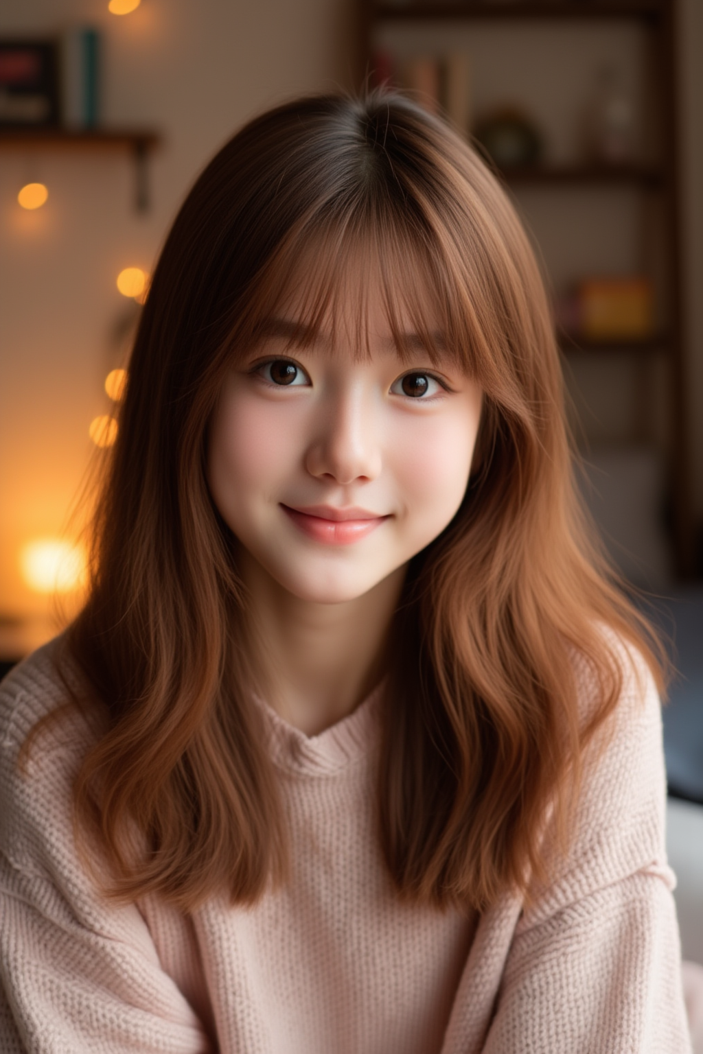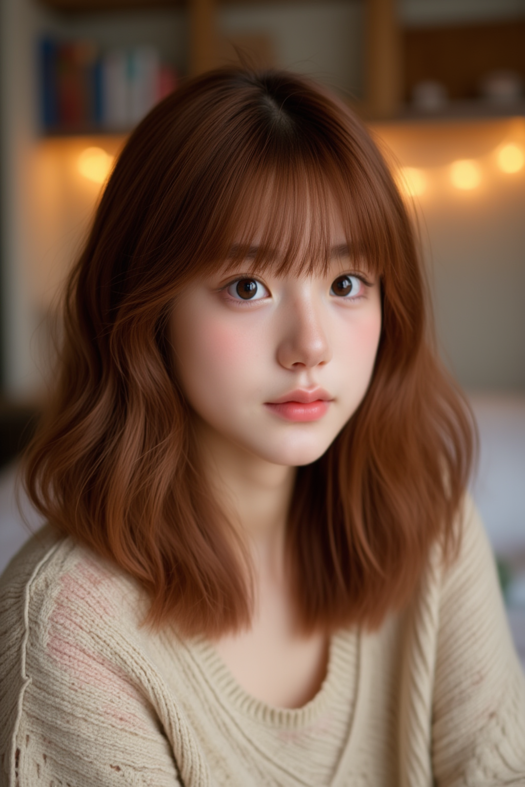 A close-up shot of a girl with shoulder-length wavy auburn hair, wearing a pastel-colored sweater. The background is a cozy bedroom with soft lighting and faint details of a bookshelf and warm fairy lights. The light falls gently on her hair, highlighting its texture. Best quality, High resolution, Masterpiece (1.3), GHUN.