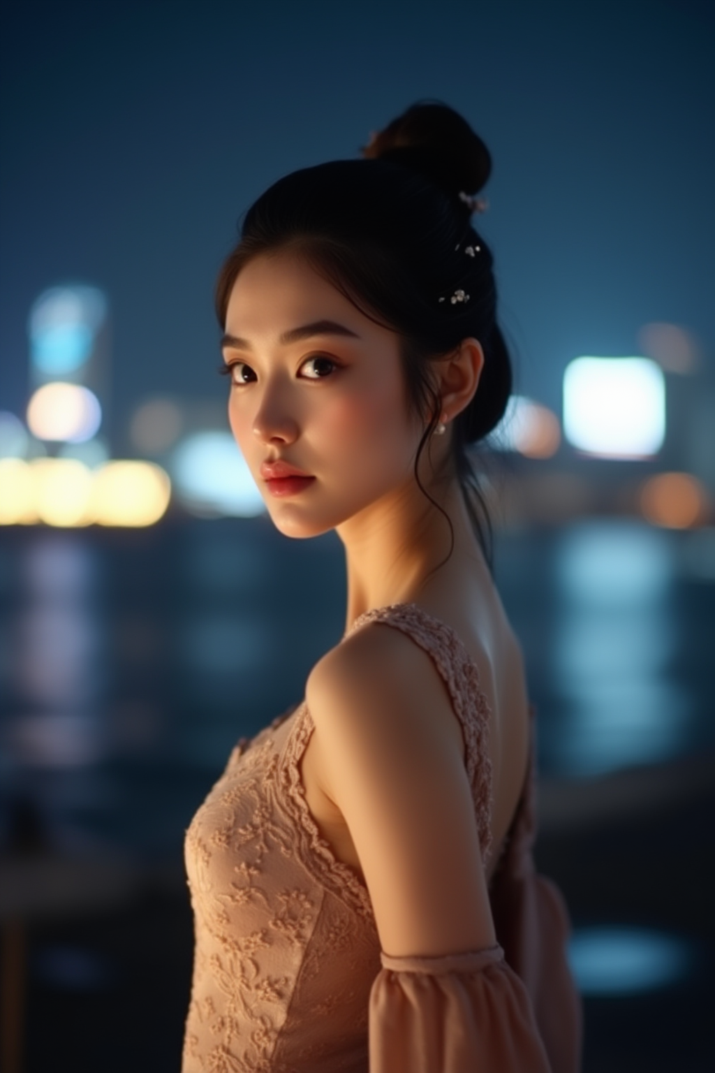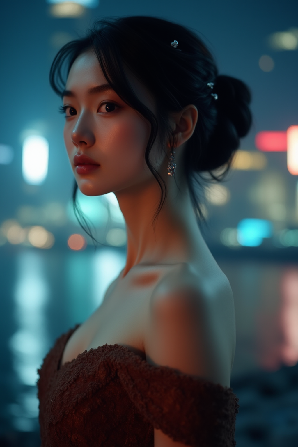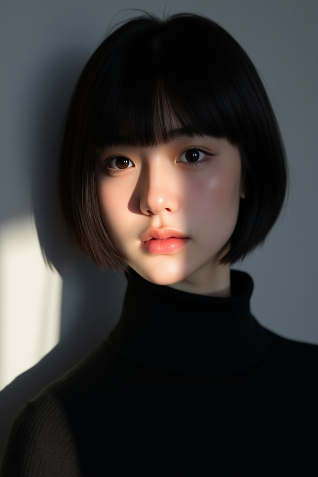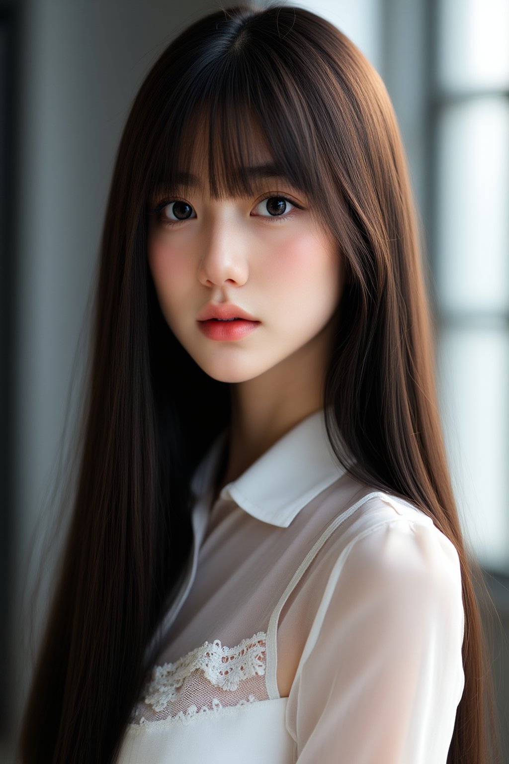 A close-up shot of a girl with shoulder-length wavy auburn hair, wearing a pastel-colored sweater. The background is a cozy bedroom with soft lighting and faint details of a bookshelf and warm fairy lights. The light falls gently on her hair, highlighting its texture. Best quality, High resolution, Masterpiece (1.3), GHUN.