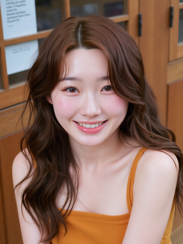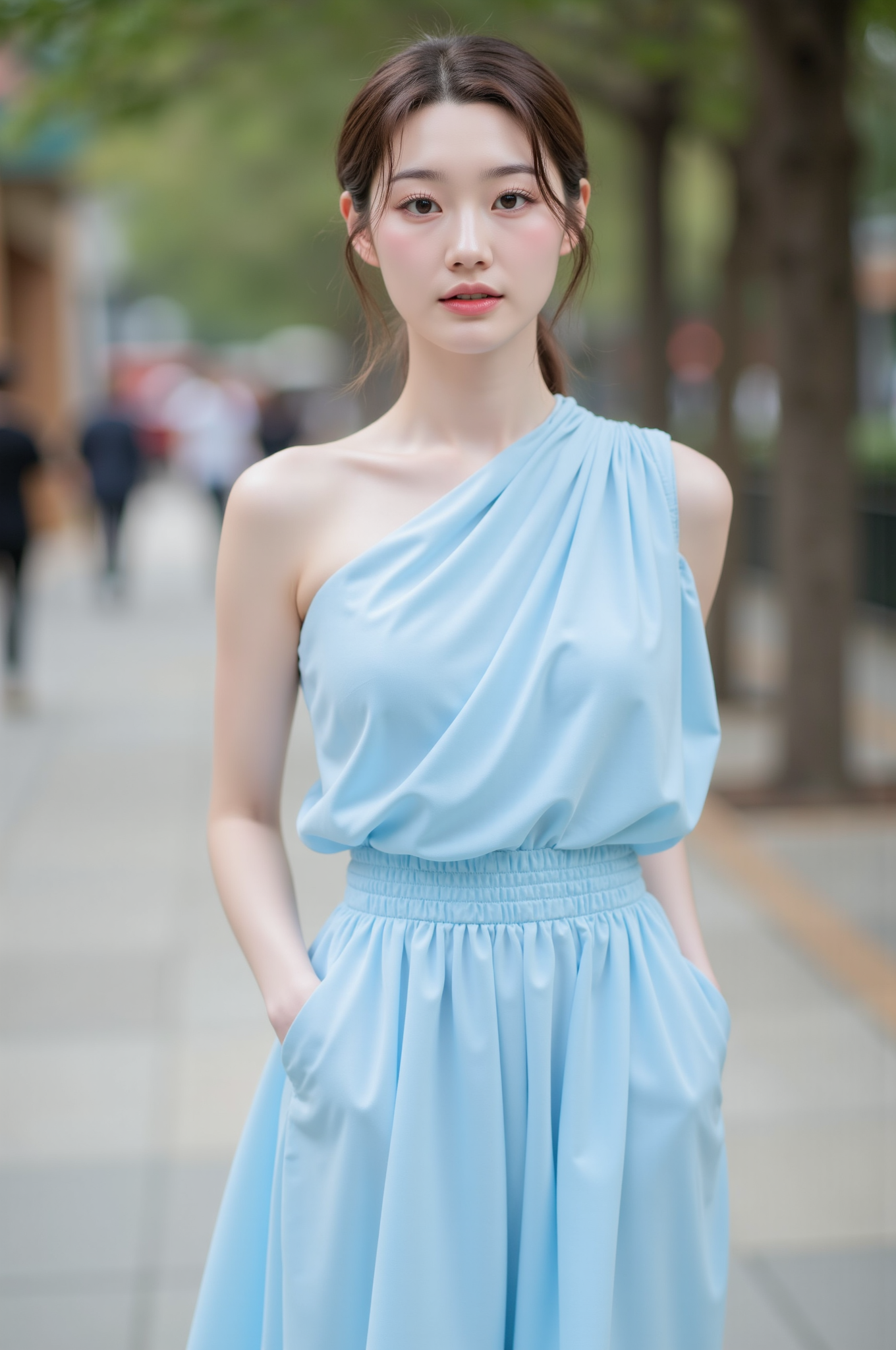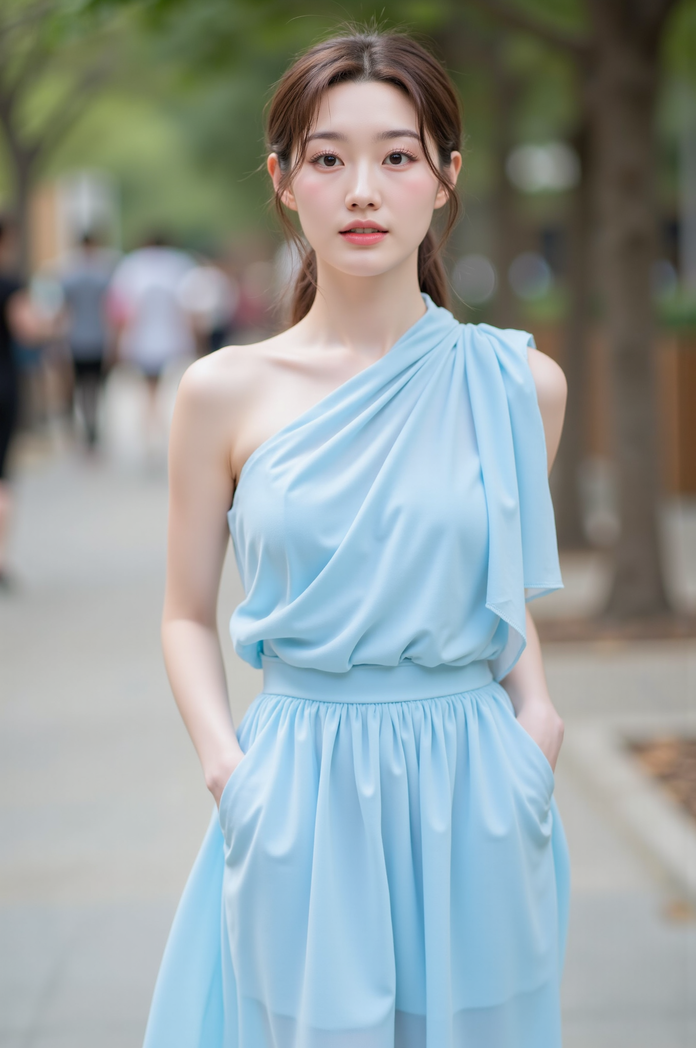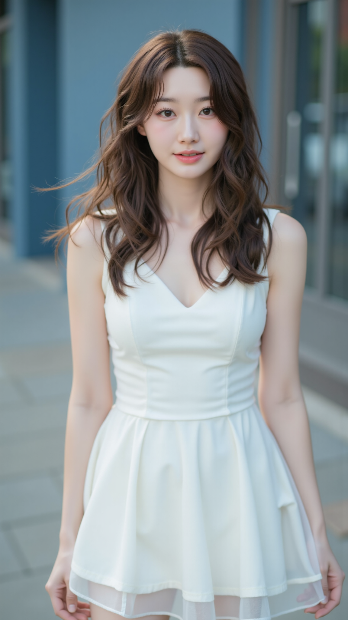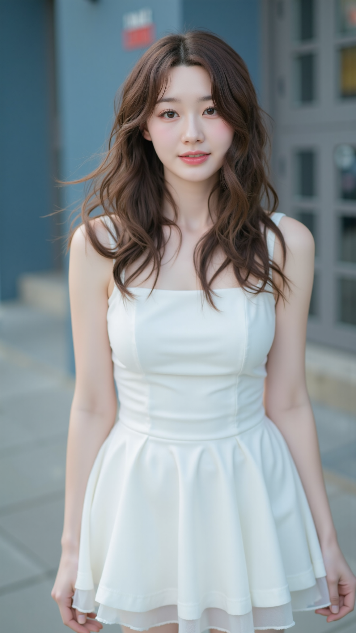 A young woman with long, wavy brown hair styled in a loose half-updo, standing under a clear blue sky. She is wearing a delicate white lace dress with spaghetti straps and intricate details around the neckline, exuding an elegant and airy feel. Her soft, natural makeup complements her youthful complexion, and her expression is serene, with a subtle, dreamy gaze directed towards the camera. The bright, sunny atmosphere enhances the vibrant colors, and the blurred background of greenery and a distant structure adds depth to the image.