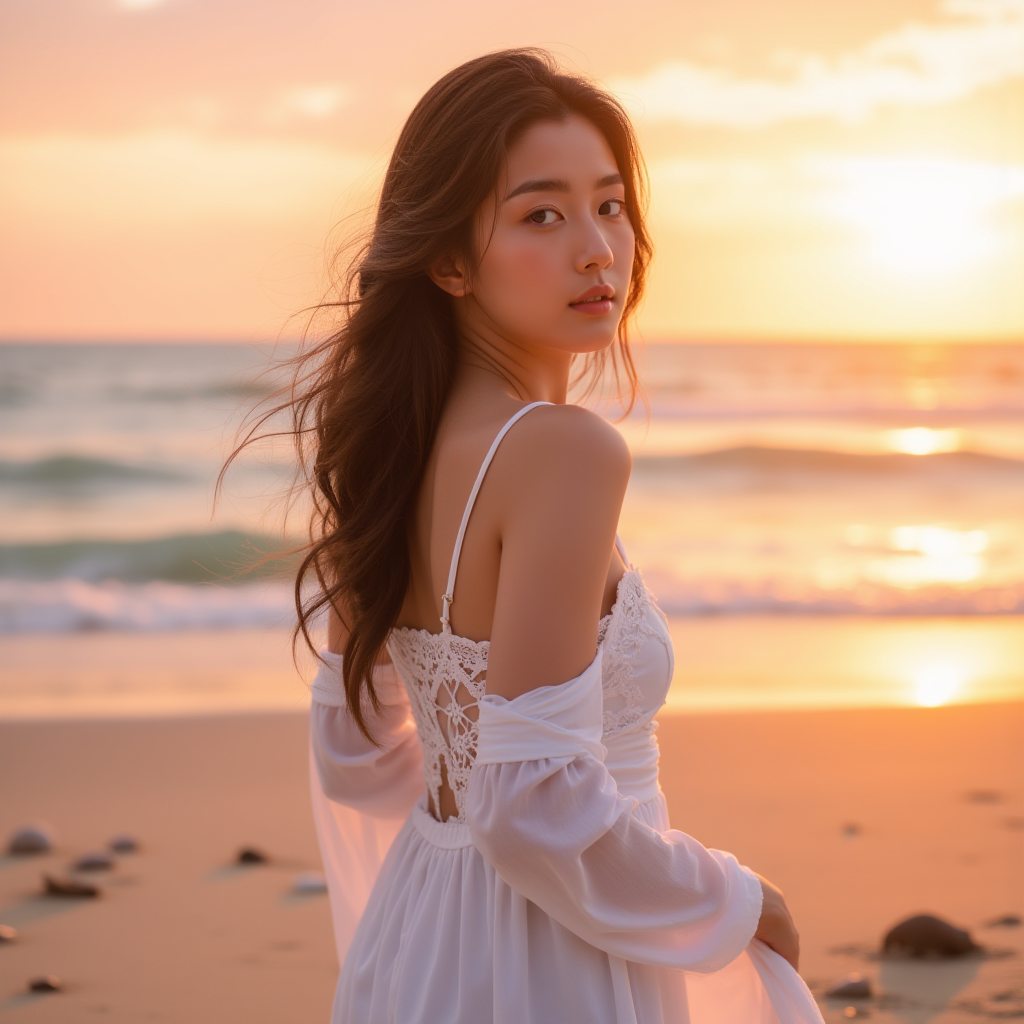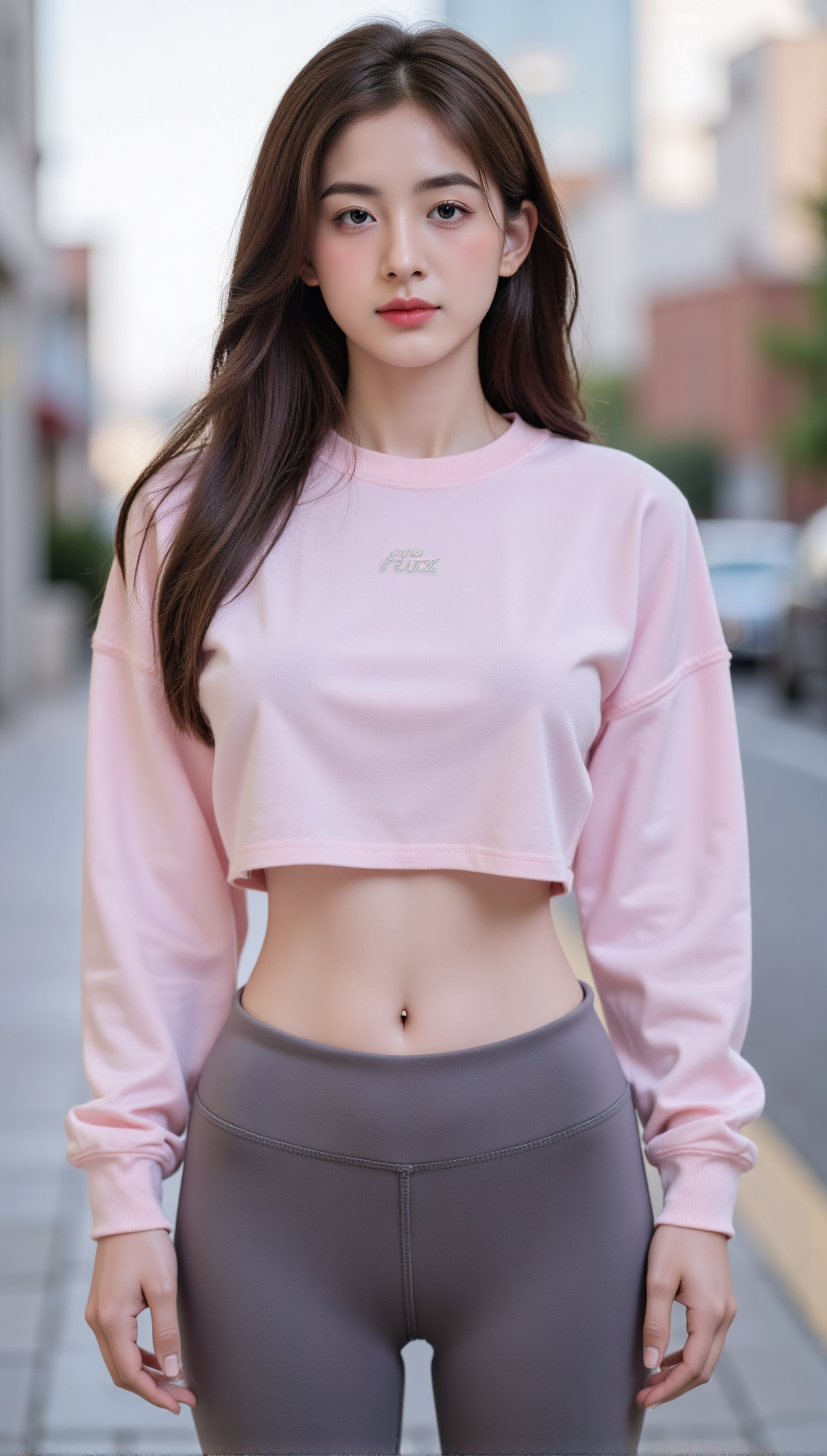 A masterpiece portrait of an 18-year-old Korean gravure model. The camera is positioned in a cowboy shot, focusing on her stunningly beautiful face and captivating eyes that sparkle like diamonds under sidelights. Her loving smile brightens up the frame as she gazes directly at the viewer. Her skin glistens with a radiant glow, complemented by her long, black hair cascading down her back. She wears white low-leg panties and a thigh-high sports top, showcasing her perfect body and exposed navel. Her medium-sized breasts are subtly accentuated, drawing attention to her toned physique. The overall aesthetic is one of sensuality and allure, as she confidently poses with her shiny hair and skin on full display.