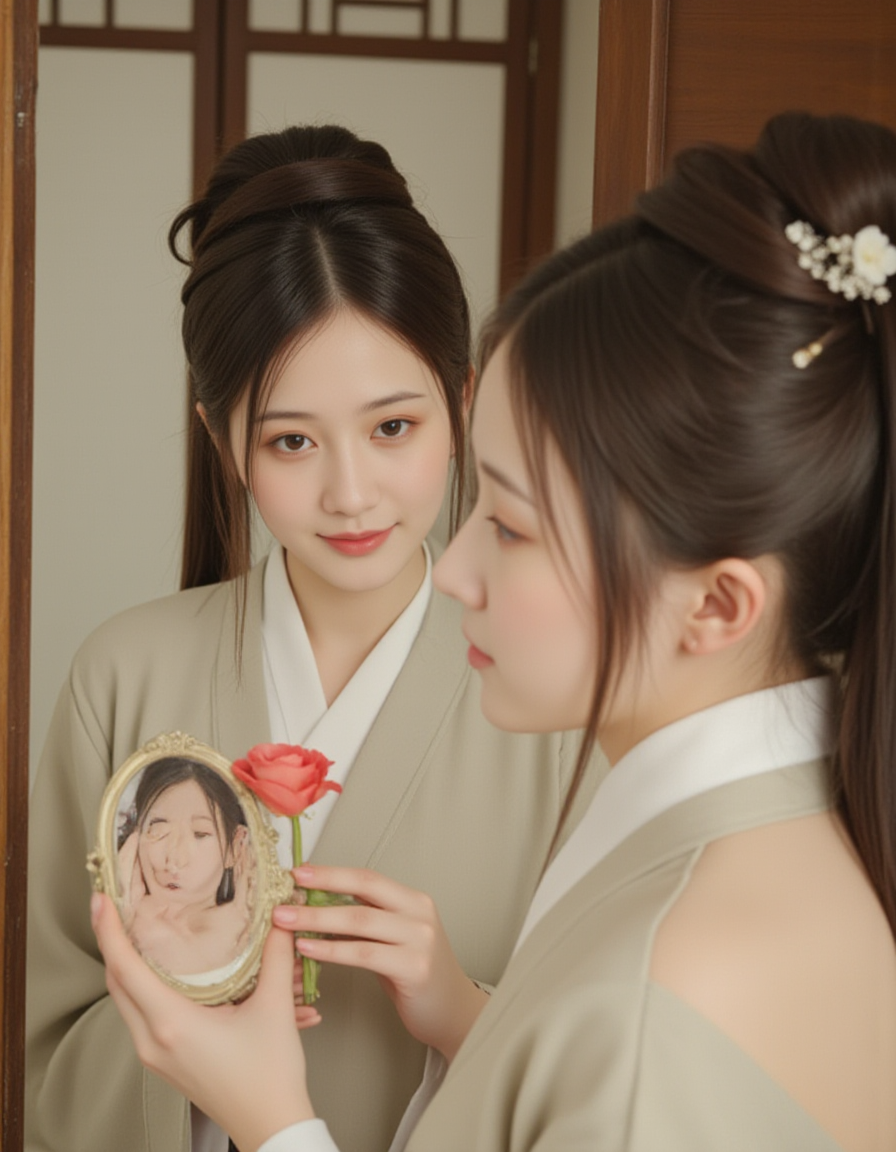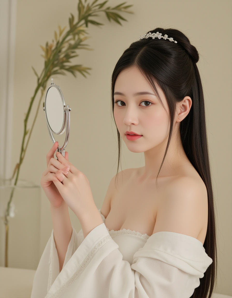 F1CNShinvXZ,A woman in traditional attire, holding a mirror and examining her reflection.