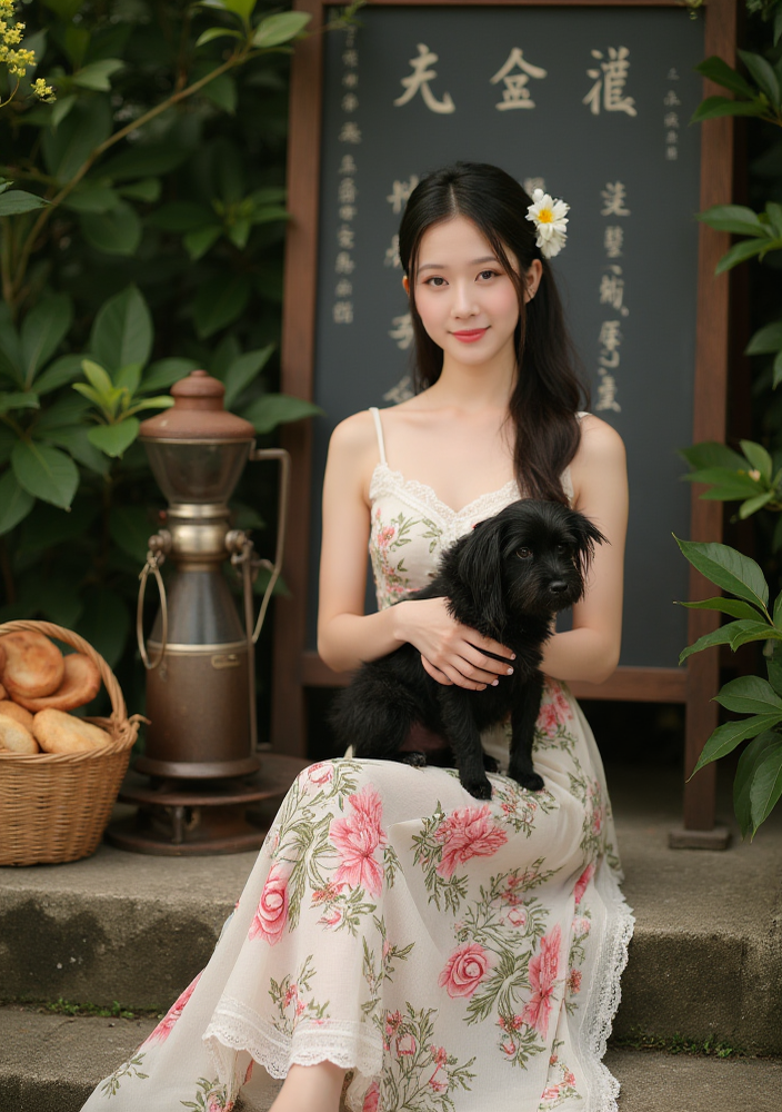 F1CNShinvXZ,Elegant Portrait of a Woman in Traditional Asian Attire, Surrounded by Flowering Plants.
