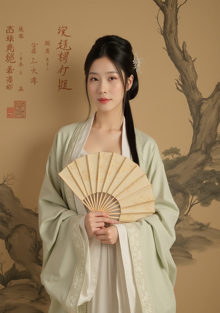 F1CNShinvXZ,A woman in traditional East Asian attire, holding a fan and standing before an intricate landscape painting.