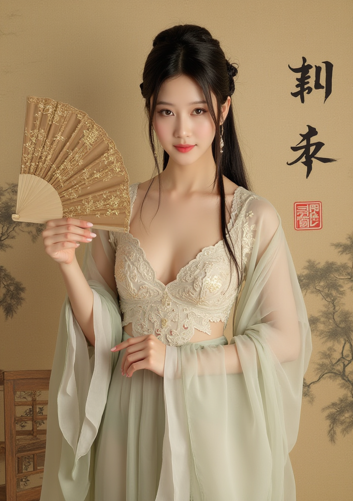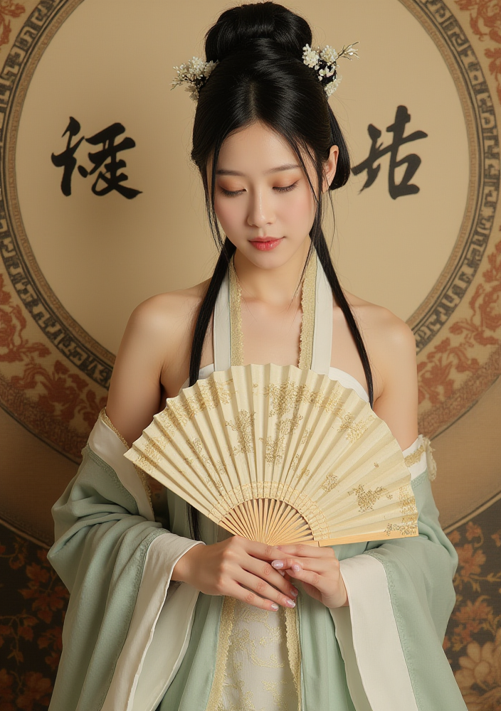 F1CNShinvXZ,A woman in traditional East Asian attire, holding a fan and standing against an ornate backdrop with Chinese characters.