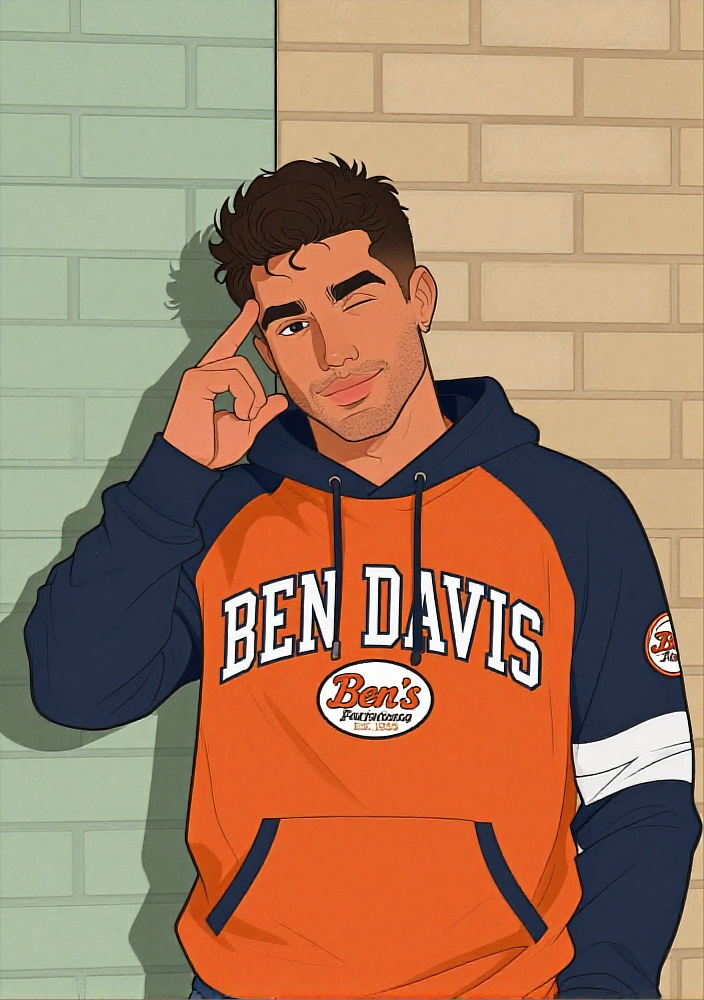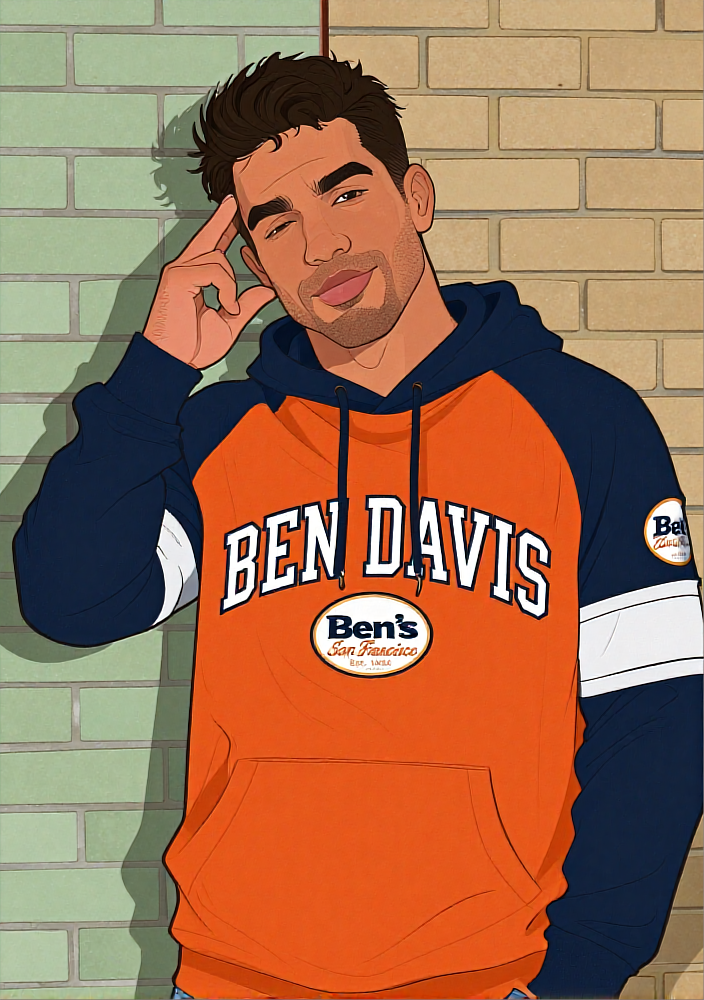 ZitMansRoom, An illustration depicts A young man with short dark hair and light stubble leans casually against a two-toned brick wall—pale green on the left, beige on the right—resting his right hand near his temple. He wears a color-blocked hooded sweatshirt: navy blue on the shoulders, sleeves, and hood, with a vibrant orange torso featuring large arched “BEN DAVIS” lettering in white with black outline, and a circular “Ben’s San Francisco California Est. 1935” logo beneath. A matching circular patch appears on the left sleeve, and a white stripe accents the forearm. His expression is relaxed and slightly playful, eyes crinkled in a gentle smile. Soft, even lighting illuminates his face and the textured fabric of the hoodie, suggesting an indoor setting with natural or diffused light.