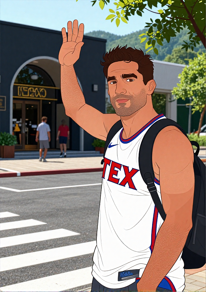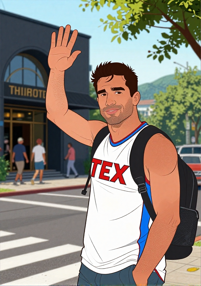 ZitMansRoom, An illustration depicts A man with short dark hair and light stubble waves with his right hand while standing on a paved street under bright daylight; he wears a white sleeveless athletic jersey with red “TEX” lettering and blue-red side stripes, and carries a black backpack over his left shoulder. Behind him, a modern building with a dark facade and arched entrance features gold signage above glass doors, where several blurred pedestrians walk. Lush green foliage frames the right edge, and distant hills rise under a clear sky. White crosswalk lines mark the asphalt near his feet, and his relaxed posture conveys a casual, friendly demeanor.