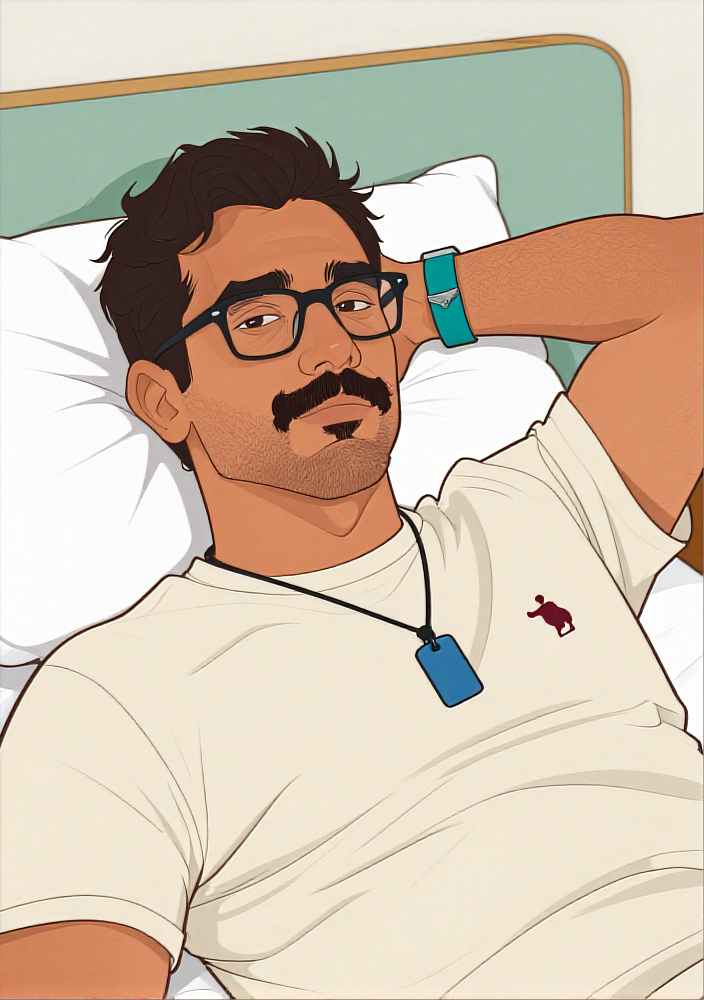 ZitMansRoom, An illustration depicts A man with short dark hair, a mustache, and a goatee lies back on a white pillow, resting his head against a light green headboard. He wears black-rimmed glasses, a cream-colored t-shirt with a small maroon logo on the left chest, and a black cord necklace with a blue rectangular tag. His right arm is bent behind his head, revealing a teal silicone watch strap. Soft, even lighting illuminates his face and upper body, highlighting the smooth texture of the fabric and the matte finish of the watch. The background is minimal and bright, suggesting a calm, modern indoor setting. His expression is neutral and direct, conveying quiet confidence.