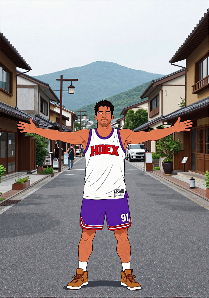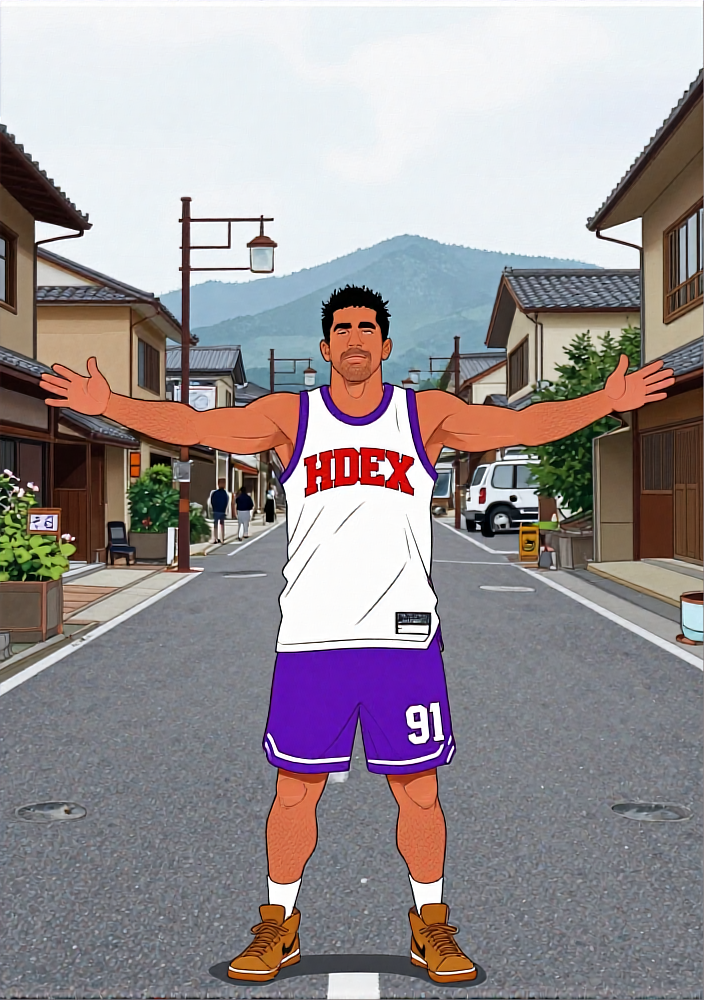ZitMansRoom, An illustration depicts A man stands centered on a quiet asphalt street, arms outstretched wide, wearing a white basketball jersey with red “HDEX” lettering and purple trim, paired with matching purple shorts featuring a white “91” logo. He has short dark hair, a light beard, and wears white socks with brown high-top sneakers. Traditional Japanese-style buildings with tiled roofs line both sides of the street, interspersed with street lamps and parked vehicles. Distant mountains rise under a bright, overcast sky, casting soft, even light. A few pedestrians appear far down the road, and greenery peeks from planters along the sidewalks. The scene conveys openness and calm confidence.
