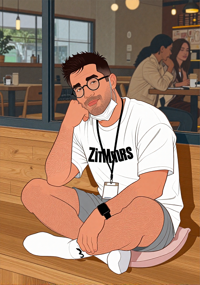 ZitMansRoom, An illustration depicts A man with short dark hair, a light beard, and round glasses sits cross-legged on a wooden floor, resting on a pale pink cushion. He wears a white oversized T-shirt with bold black lettering, gray shorts, white socks with a black swoosh logo, and a black smartwatch. A white face mask hangs from a lanyard around his neck, and he tilts his head slightly, propping his chin on his right fist while looking toward the camera. Behind him, large glass panels reflect interior elements and show two women seated at a table, one in a beige blazer. Warm natural light illuminates the scene, highlighting the wood grain and soft textures, creating a relaxed, casual atmosphere in what appears to be a modern café or lounge space.