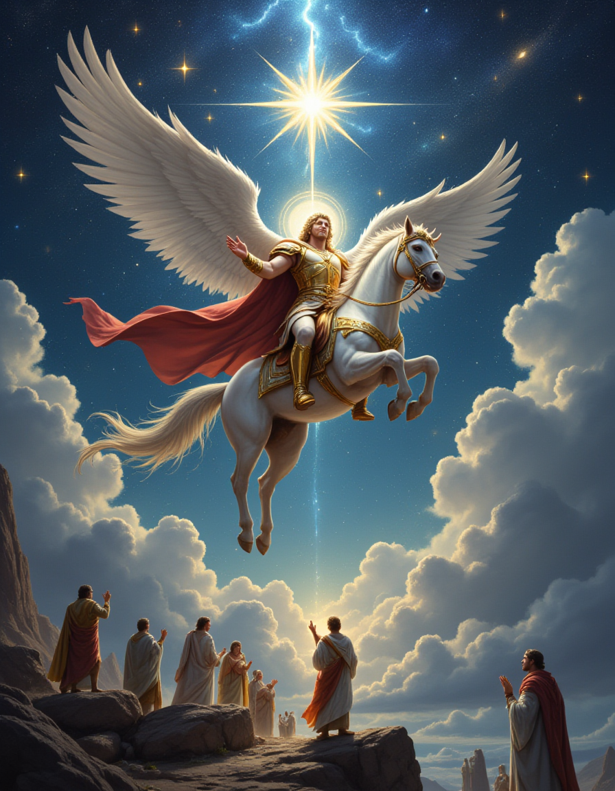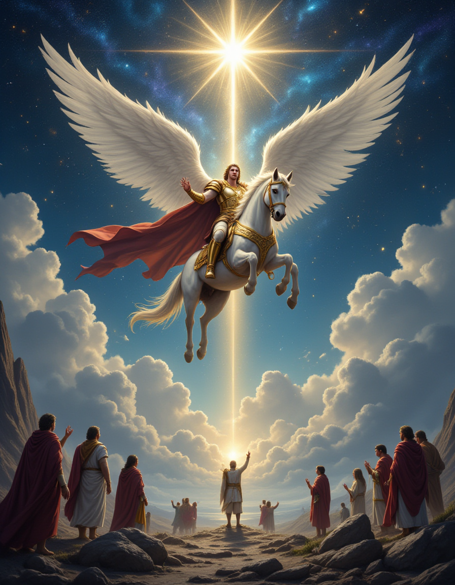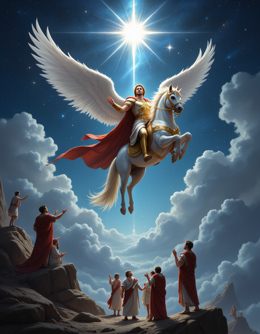 F1EUSKnight, The image depicts a majestic scene with a winged figure riding a horse, soaring through a starry night sky. The rider is adorned in golden armor and a flowing red cape, exuding a sense of grandeur and divinity. The horse is white with golden accents, and its mane and tail are flowing as it glides through the air. Above, a radiant star shines brightly, casting a beam of light that illuminates the surrounding clouds. In the foreground, there are several figures standing on a rocky outcrop, gazing up at the winged figure. They appear to be in a state of awe or reverence, with some holding their hands up as if in supplication. The rocky terrain and the dramatic lighting enhance the sense of wonder and majesty in the scene. The overall atmosphere is one of divine presence and celestial beauty, with the night sky filled with stars and clouds adding to the ethereal quality of the image.
