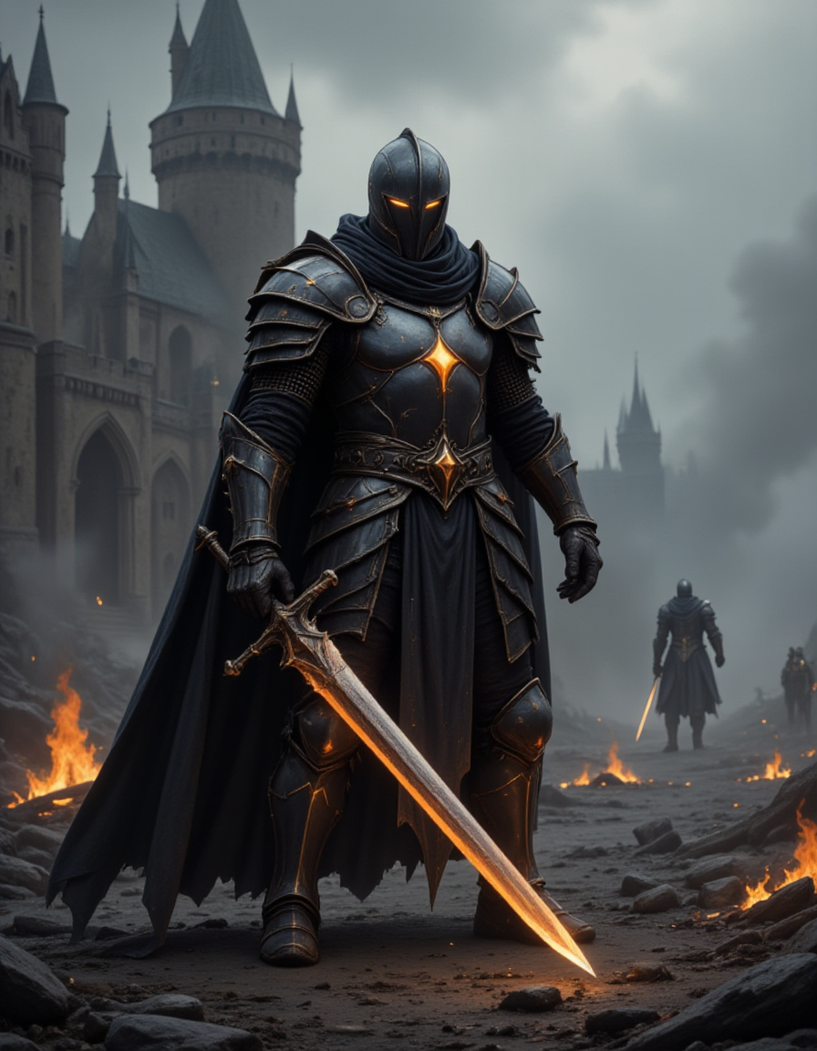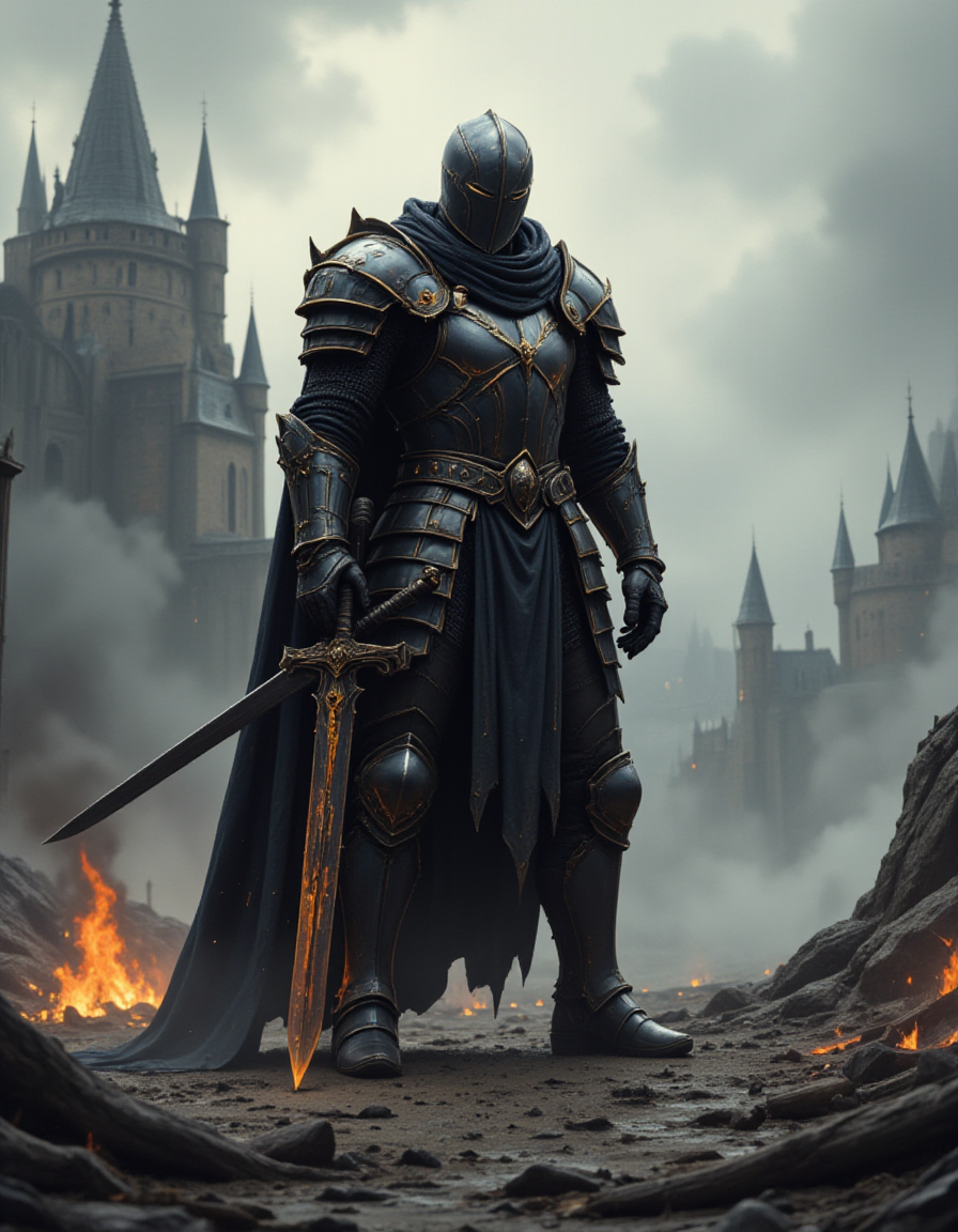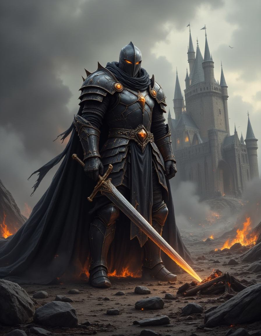 F1EUSKnight, The image depicts a dark knight standing in a desolate, fiery landscape. The knight is clad in black armor with glowing orange accents, including a prominent sword in his right hand. The armor is intricately designed, with a large, imposing presence. The background features a gothic-style castle with spires, partially obscured by smoke and fire. The ground is rocky and littered with embers, suggesting a recent battle or destruction. The overall atmosphere is ominous and foreboding, with a sense of impending doom.