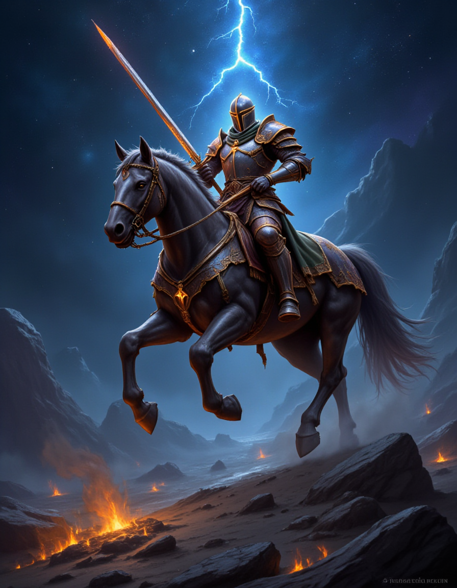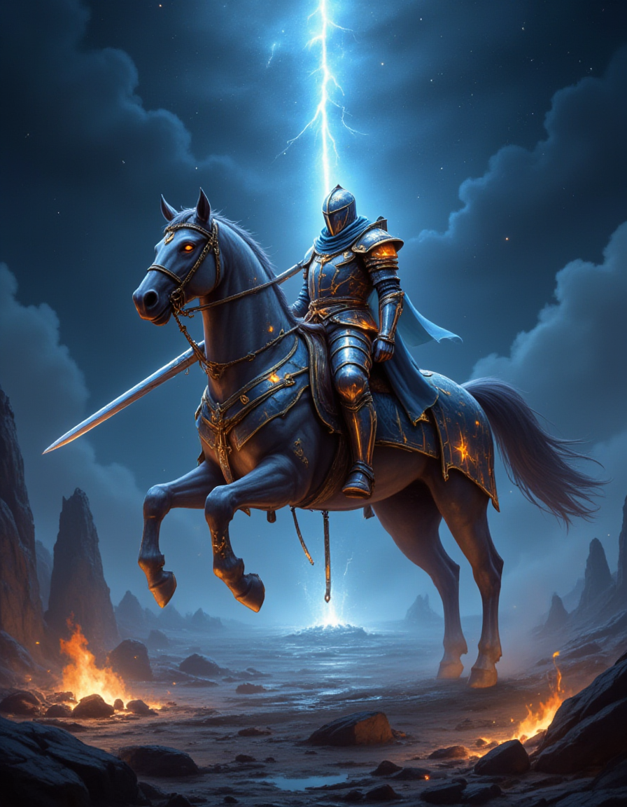F1EUSKnight, The image depicts a knight on horseback, clad in intricate armor with glowing orange accents. The knight is wielding a long sword, which is pointed diagonally upwards. The horse is also armored, with a similar glowing design, and appears to be galloping or charging forward. The background features a starry night sky with a faint, ethereal blue light, suggesting a mystical or otherworldly setting. The ground is rocky and ablaze with small, bright orange flames, adding to the dramatic and fantastical atmosphere of the scene.