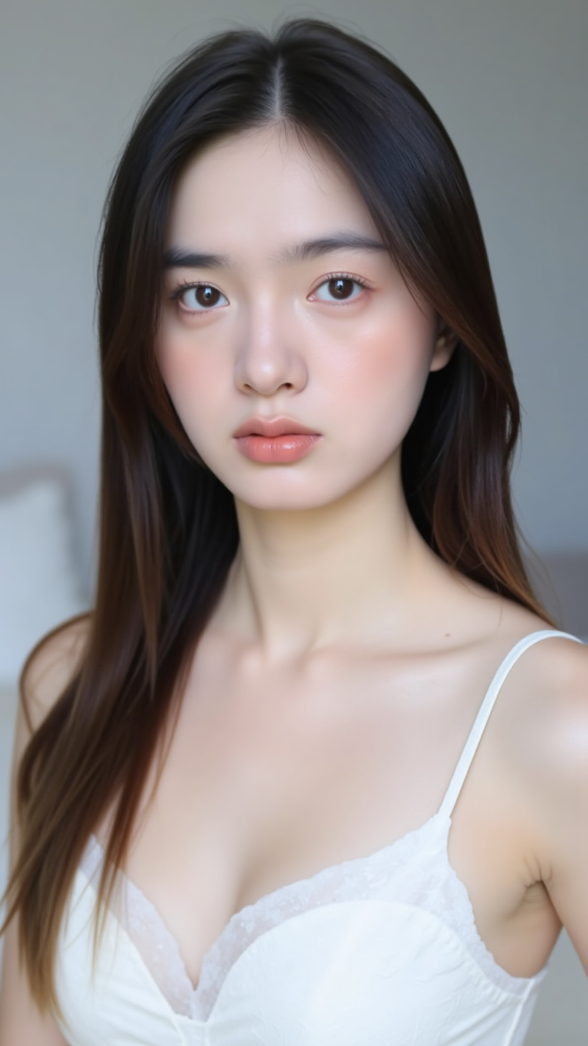 The background is minimalistic, with neutral tones. A white wall, a beige-colored table with a few items on it, and a standing lamp are visible, creating a clean and uncluttered setting. The lighting is soft and natural, likely from a nearby window, casting a gentle glow on her face and adding warmth to the image. The overall color tone is muted and pastel, which complements her outfit and adds a cozy, inviting feel to the photo.