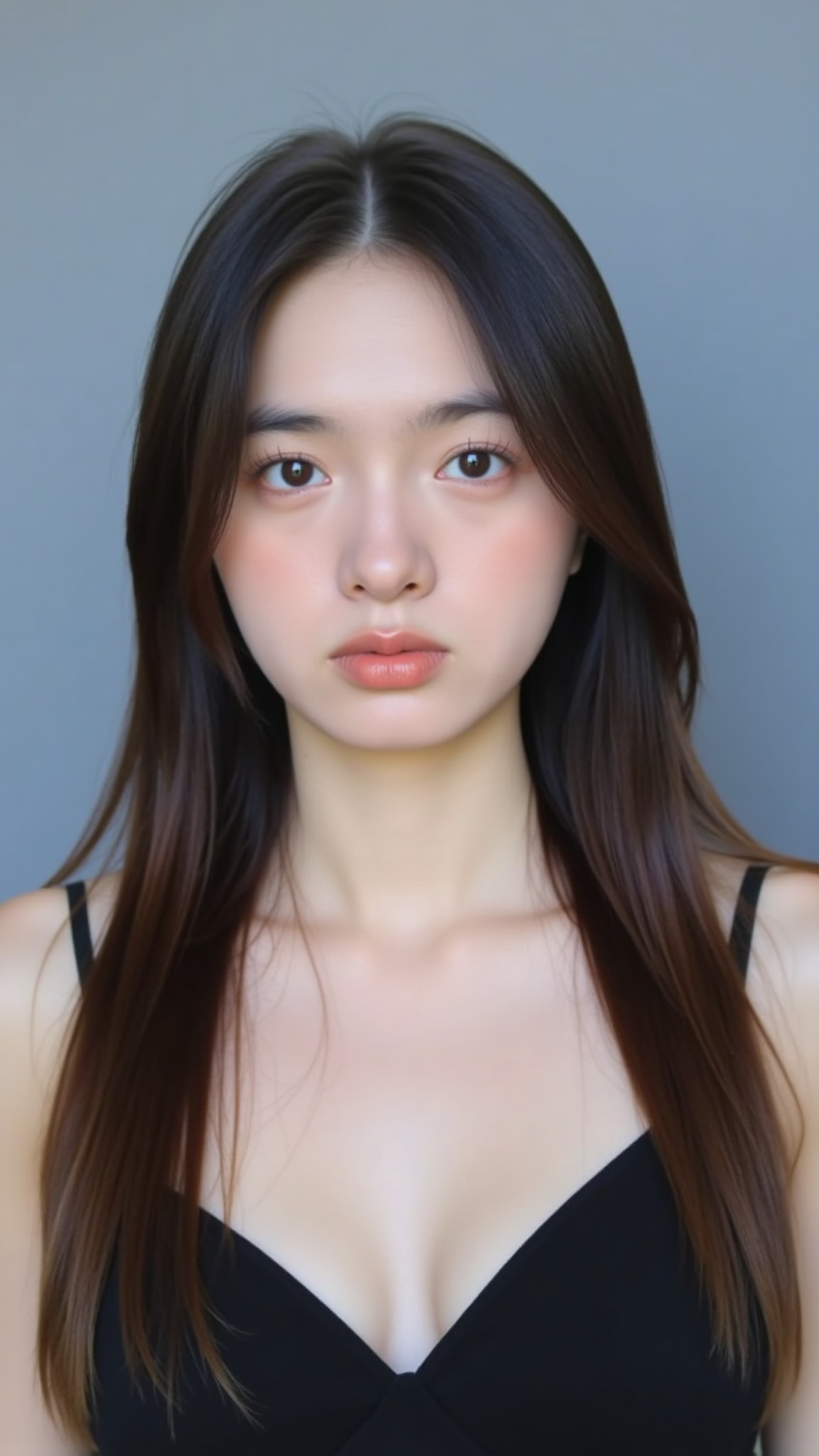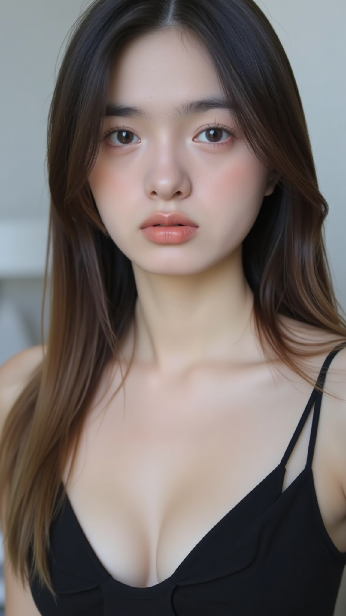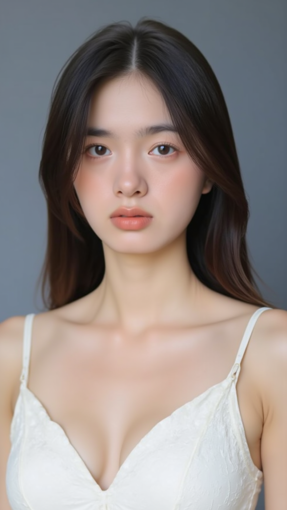 ===============The image features a young woman with long, dark brown hair styled in a loose side braid with a thick fringe framing her face. A large, pastel purple bow is tied into her braid, adding a playful touch to her hairstyle. She is wearing a fitted, sleeveless, lavender-colored crop top, made from a soft, stretchy material, possibly cotton or a cotton blend. The crop top has a simple, round neckline with no visible patterns or textures.ghun