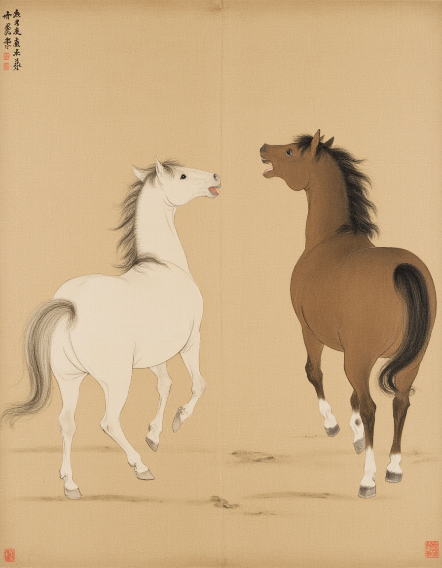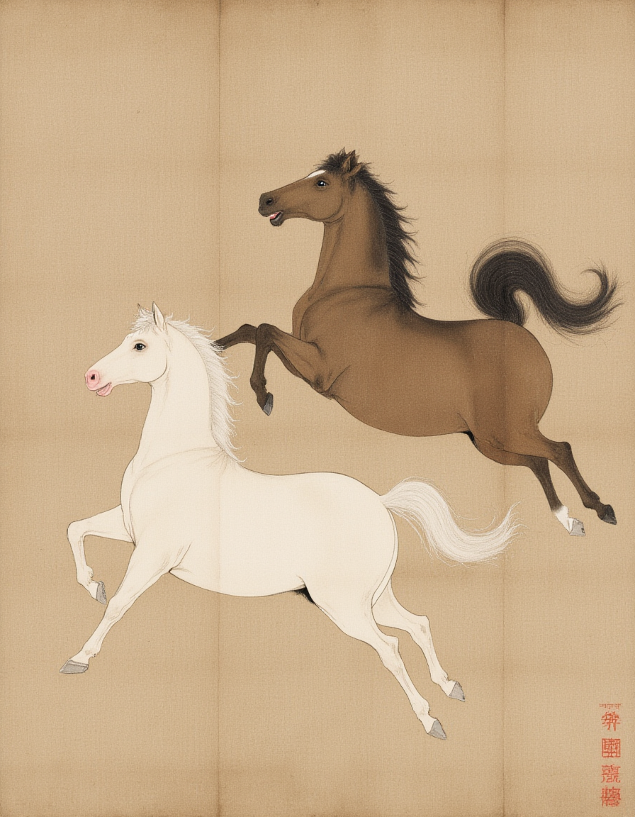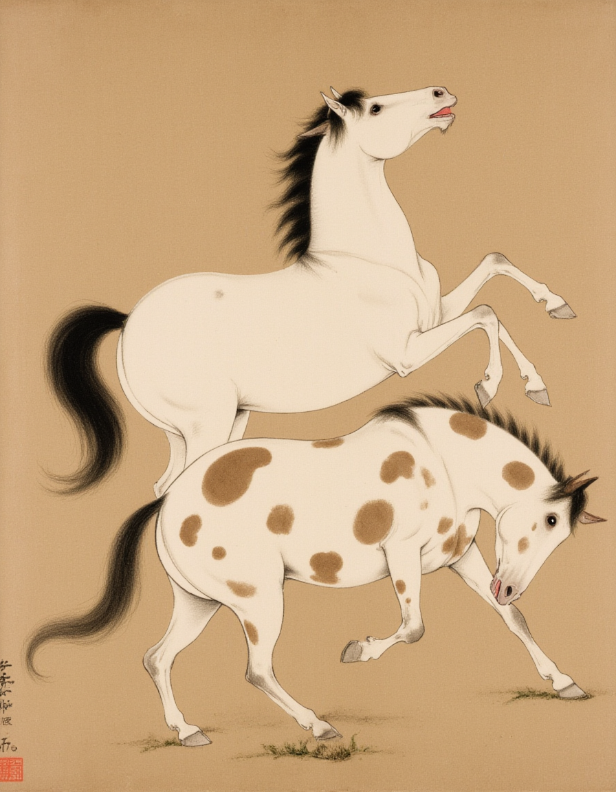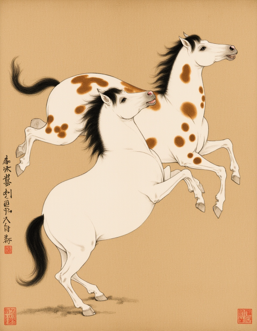 F1hanganHuaM, The image depicts a traditional East Asian painting featuring two horses. The horse on the left is white with a black mane and tail, and it appears to be in a dynamic, energetic pose, possibly running or rearing. The horse on the right is a spotted horse, predominantly white with large brown spots, and it is also in motion, seemingly leaping or rearing. The background is a simple, muted earth tone, which helps to emphasize the horses as the central focus of the artwork. The painting style is characterized by fine lines and minimalistic details, typical of East Asian ink wash paintings.