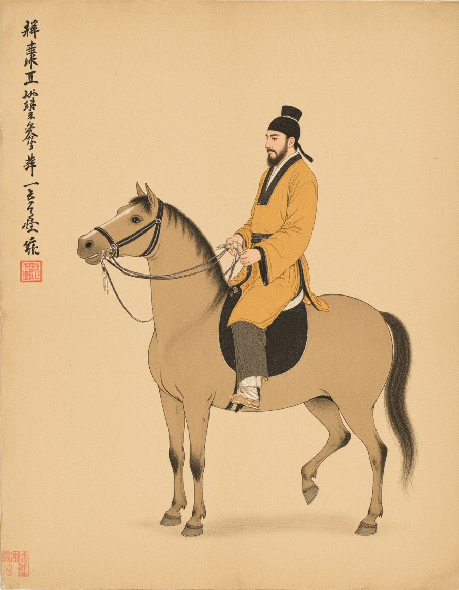 F1hanganHuaM, The image depicts a traditional East Asian painting of a man riding a horse. The man is dressed in historical attire, including a long robe and a headpiece, suggesting he may be a figure of significance in a historical or cultural context. The horse is depicted with a detailed mane and tail, and the rider is seated upright, holding the reins. The background is plain, with some faint text written in traditional script on the left side of the image. The overall style of the painting is reminiscent of classical Chinese art, characterized by its use of ink and brushwork.