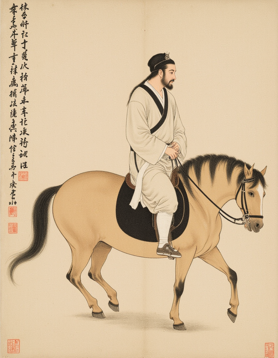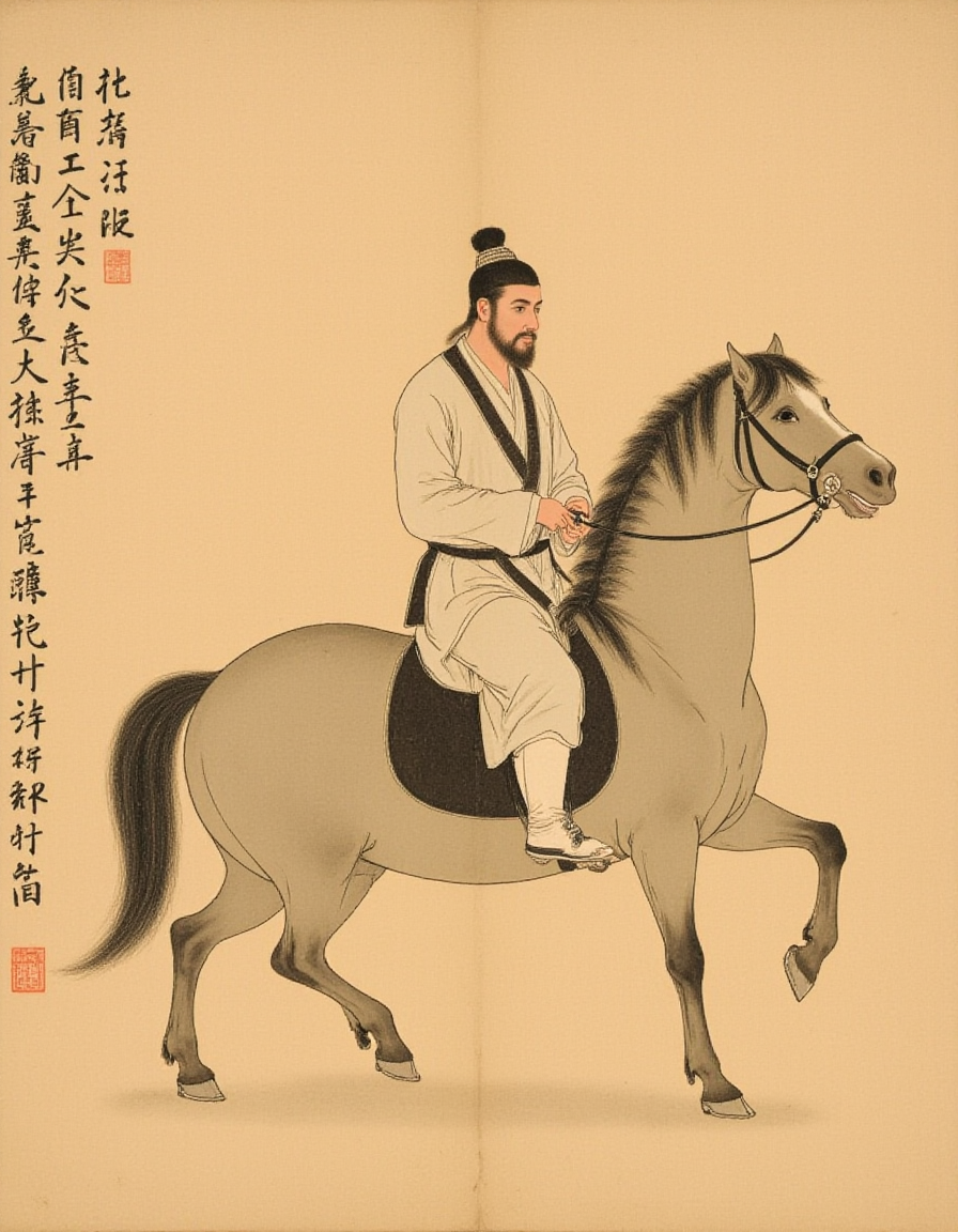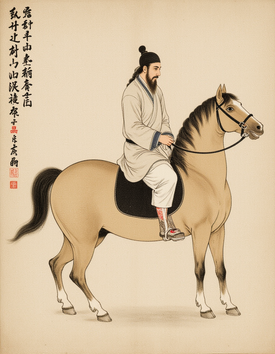 F1hanganHuaM, The image depicts a historical scene with a figure riding a horse. The rider is dressed in traditional attire, including a robe and a head covering, suggesting a historical or cultural context. The horse is depicted with detailed lines, showing its muscular structure and movement. The background is plain, likely to emphasize the figures in the foreground. The painting style is reminiscent of East Asian art, with a focus on historical or cultural themes. The text on the right side of the image appears to be in Chinese characters, which may provide additional context or meaning to the scene.
